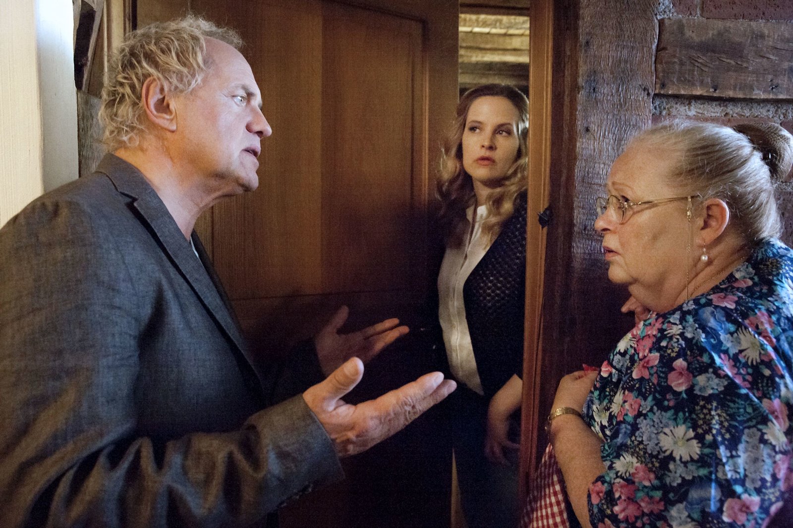 Wo die Liebe hinfälltKillmer (Uwe Ochsenknecht) muss bei Kati (Diana Amft) und ihrer Oma (Ulrike Bliefert, rechts) gut Wetter machen. Statt Kati nach ihrem Einsatz bei dem Überfall zu loben, hat er sie rüde ausgeschimpft … Zum Ausgleich lädt er sie zum Geburtstagsessen ein.Bild: © MDR/SWR/Thomas Kost
