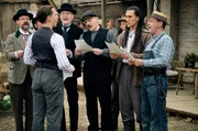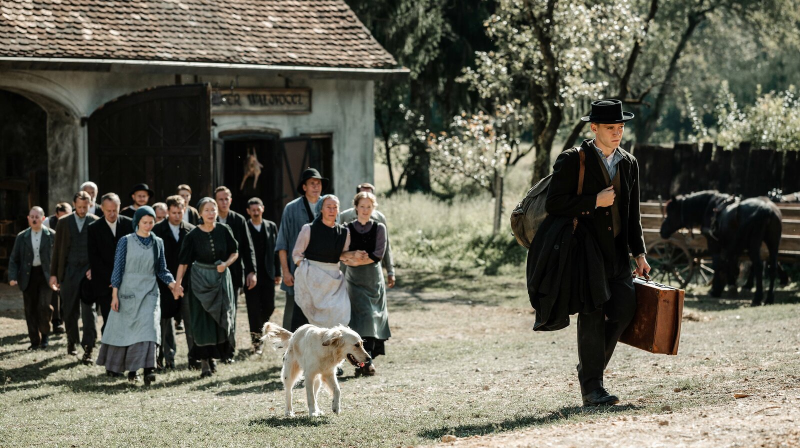 Teil 2Fidelis Waldvogel (Jonas Nay) nimmt Abschied von seiner Familie. Seine Ehefrau Eva (Leonie Benesch, vorne re.), seine Mutter (Dinah Geiger, vorne 2. v. re.) und seine Angehörigen winken zum Abschied aus der Heimat.Bild: © ARD Degeto/SWR/Moovie//Constanti / WDR Kommunikation/Redaktion Bild