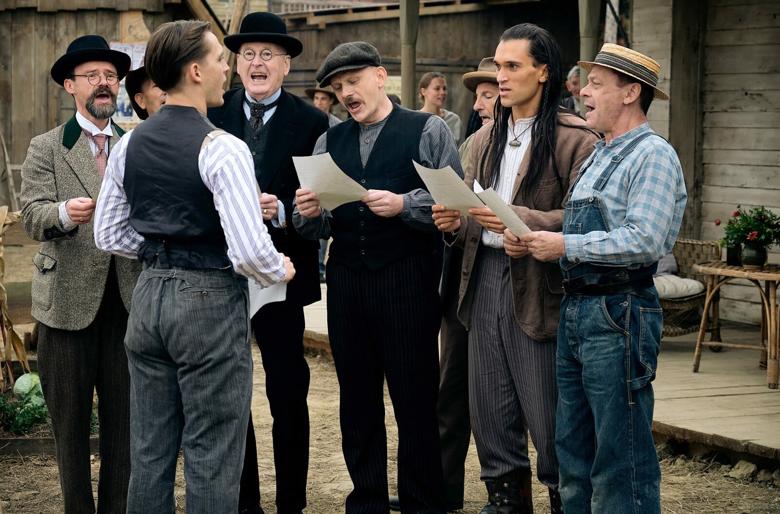 Teil 1Fidelis (Jonas Nay ) und sein Männerchor: Dr. Hagenau (Gerhard Liebmann, v.l.n.r.), Banker Zumbrugge (Jean-Pierre Cornu), Kozka (Maciej Salamon), Cyprian (Vladimir Korneev) und Robert (Sylvester Groth). Der Metzger setzt auf deutsches Liedgut.Bild: © ARD Degeto/SWR/Moovie//Constantin Film/Walter Wehner