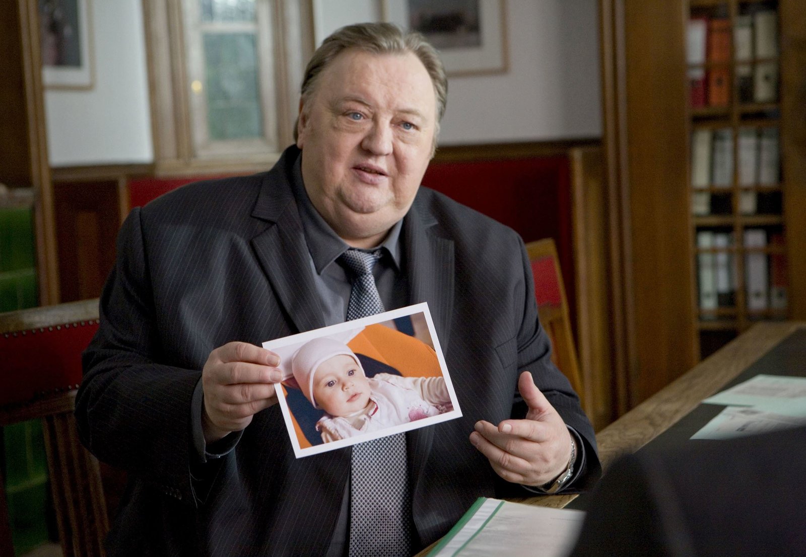Zwischen den StühlenNDR Fernsehen DER DICKE, "Zwischen den Stühlen", am Montag (17.10.11) um 21:00 Uhr. Illegale Auslandsadoption? Gregor Ehrenberg (Dieter Pfaff, l.) versucht alles, damit die kleine Laura (Komparsin) bei ihren Adoptiveltern bleiben darf.Bild: © NDR/ARD/Georges Pauly