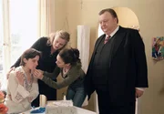 Die Nummer 1MDR Fernsehen DER DICKE FOLGE 7, "Die Nummer 1", am Samstag (22.02.14) um 09:50 Uhr. Lisas Kollegin Petra Löhnert (Jule Ronstedt, l.) ist von ihrem eifersüchtigen Mann verprügelt worden. Lisa (Ulrike Grote, 2.v.l.) und Yasmin (Burcu Dal, 2.v.r.) verarzten ihre Wunden. Gregor Ehrenberg (Dieter Pfaff, r.) rät Petra, Anzeige zu erstatten.Bild: © MDR/Marion von der Mehden