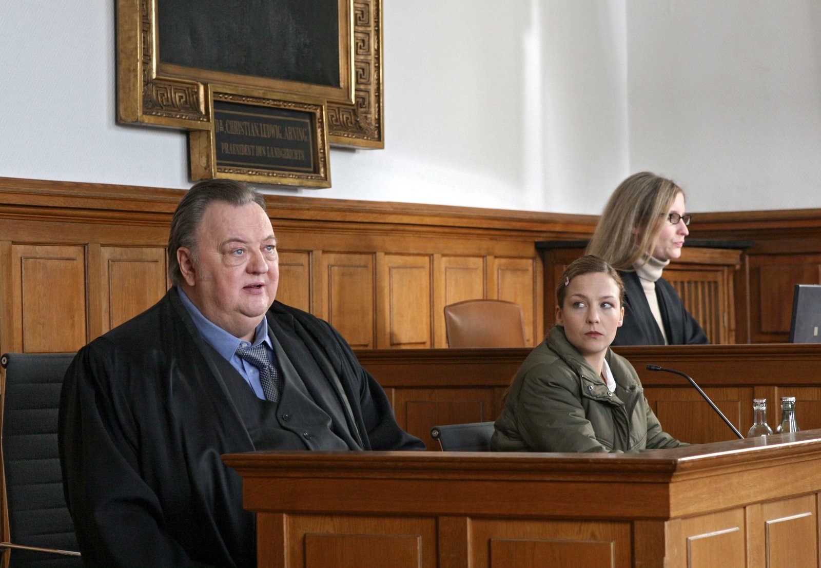 Unter VerdachtARD DER DICKE IV. Staffel, Hauptabendserie (13 neue Folgen), Folge 52 "Unter Verdacht", am Dienstag (21.08.12) um 20.15 Uhr im Ersten. Ehrenberg (Dieter Pfaff, r.) vertritt Yasmin (Sophie Dal, 2.v.l.) und Lars (Matthias Ziesing, 3.v.l.). Das Paar wird von Frau Krüger (Birge Schade, 2.v.r.) vom Jugendamt der Kindsmißhandlung beschuldigt. Die Richterin (Monika Martienzen, 3.v.r.) hört Gudrun (Katrin Pollitt, l.) als Zeugin.Bild: © ARD/Georges Pauly