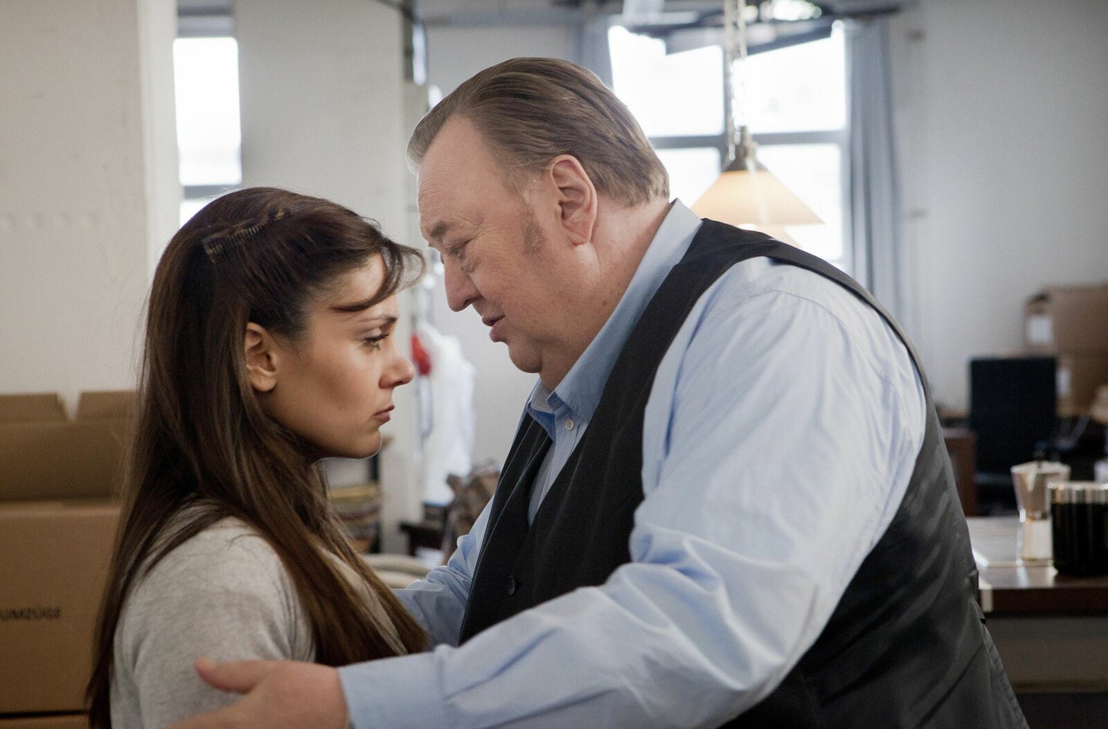 Voll ins HerzNDR Fernsehen DER DICKE, "Voll ins Herz", am Montag (24.10.11) um 21:00 Uhr. Gregor Ehrenberg (Dieter Pfaff, l.) versucht seine Assistentin Yasmin (Sophie Dal, r.) zu trösten - ihr Vater hat einen Herzinfarkt erlitten.Bild: © NDR/ARD/Georges Pauly