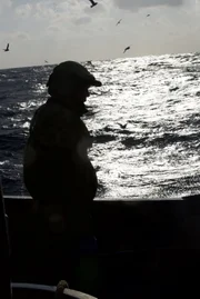 Komme, was wolle...The sun reflects off of the Bering Sea, showing the outline of Saga Deck Boss, Sean Dunlop.Bild: © Carson Doyle / Discovery Communications, LLC