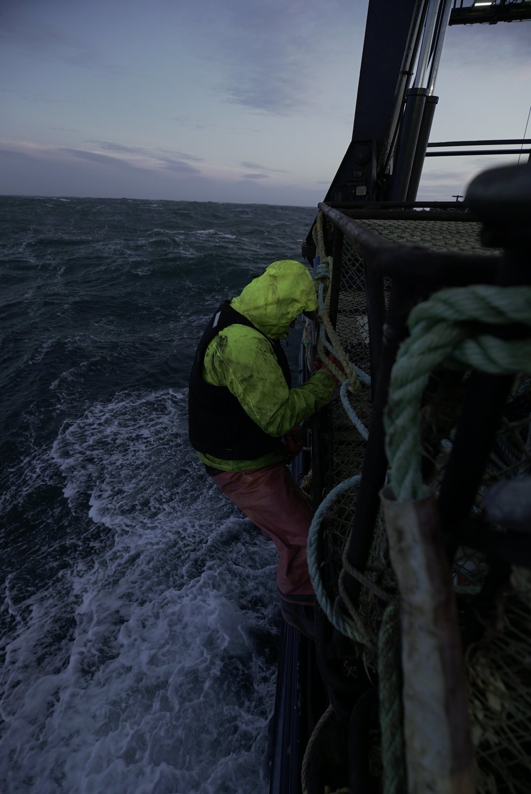 Ärger mit dem AnkerA crew member on the Brenna A hangs off the side of the stack to tie pots off.Bild: © Discovery Channel / Discovery Communications