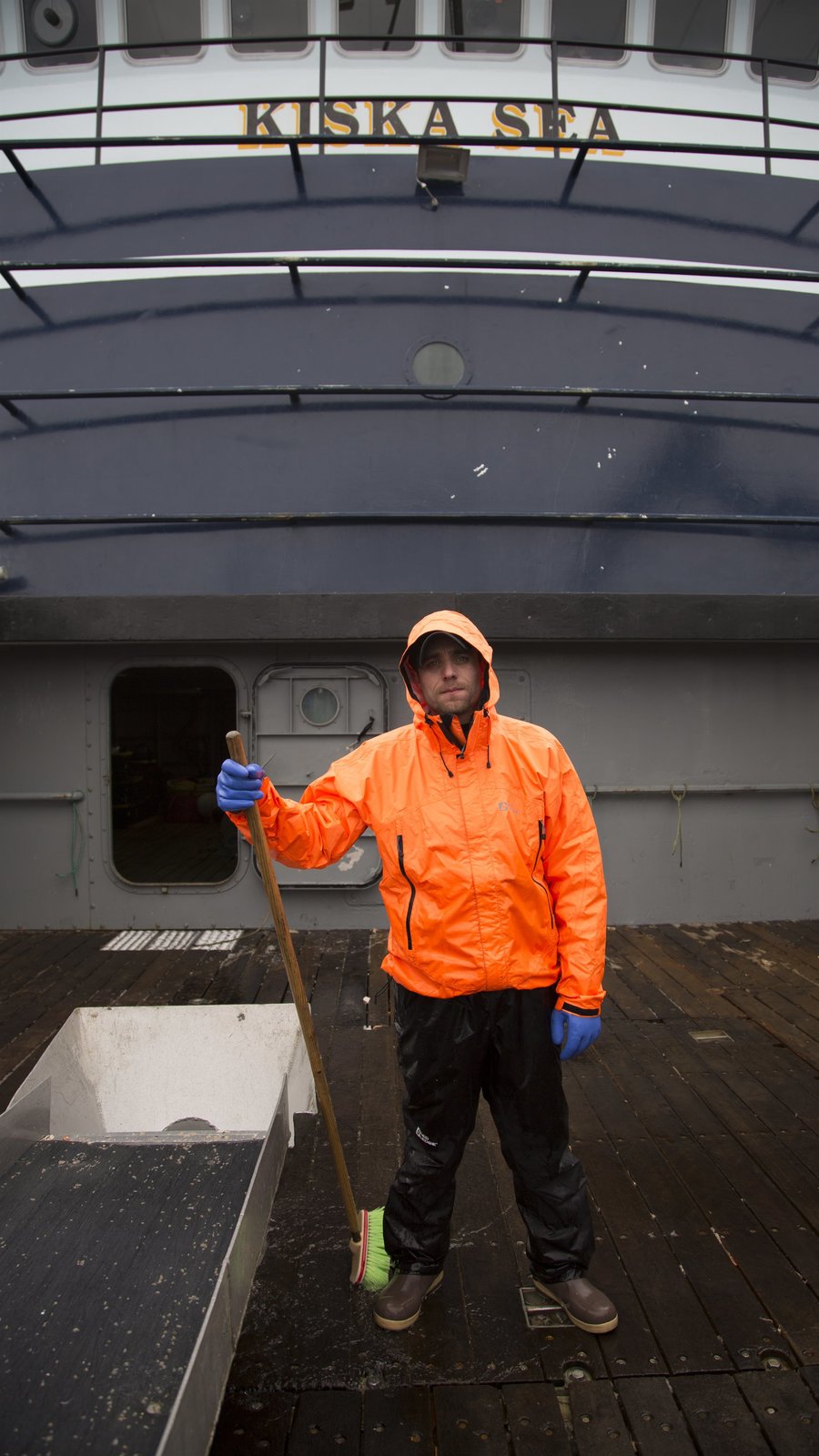 Jäger des SchwarmsMunsy, Engineer aboard the Southern Wind, stacks pots.Bild: © Discovery Communications, LLC