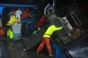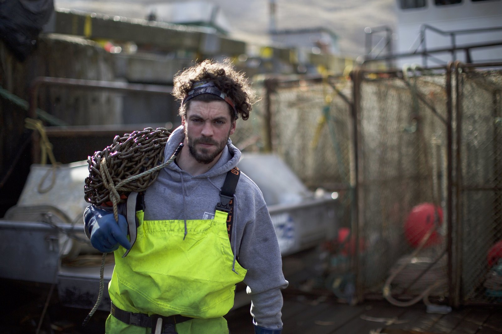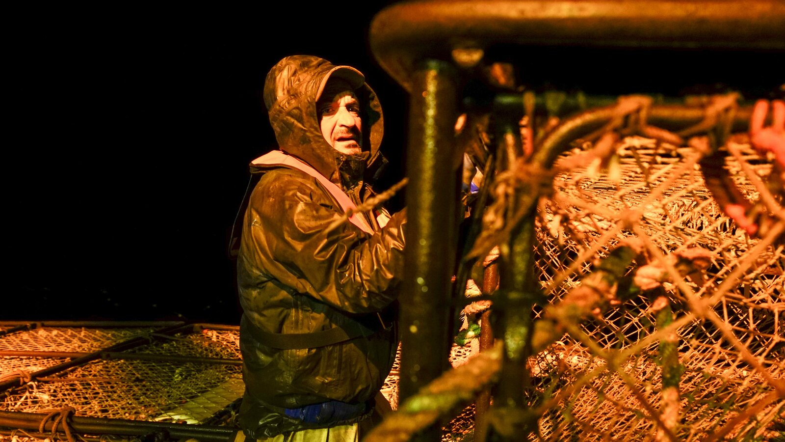 Schmerzhafte ZeitenDeckhand Nick Mavar, secures pots on the stack with ties at night.Bild: © Nate Chambers / Discovery Channel / Discovery Communications, LLC