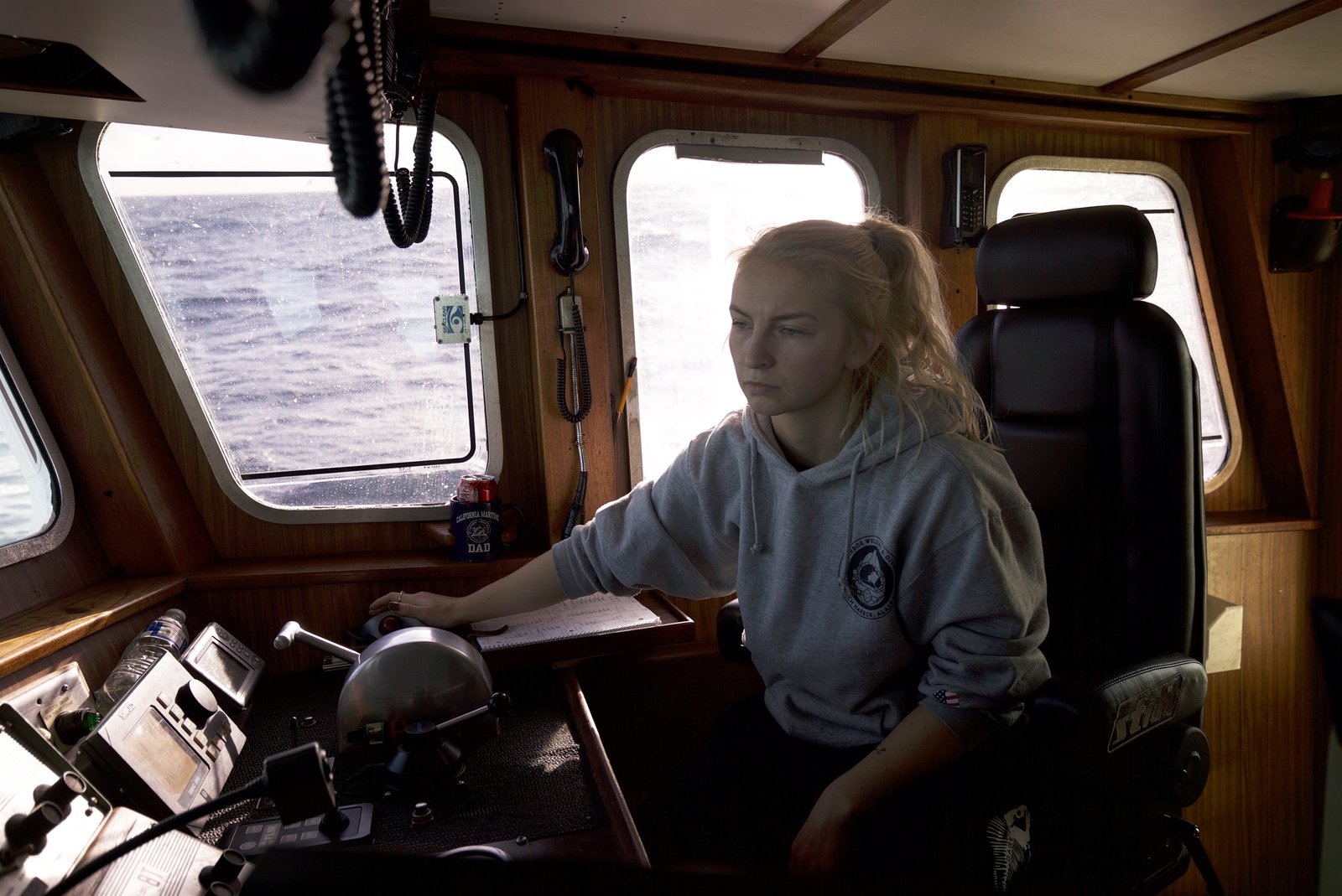 Operation auf offener SeeMandy Hansen, Captain in Training on the Northwestern, takes the wheel and takes it very seriously.Bild: © Discovery Communications, LLC