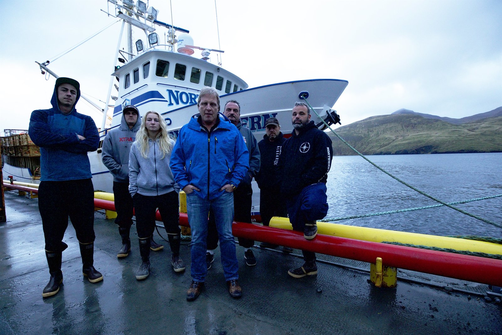 Kampf der KapitäneSig and Mandy Hansen pose with the rest of the crew in front of the docked Northwestern fishing vessel.Bild: © Discovery Channel