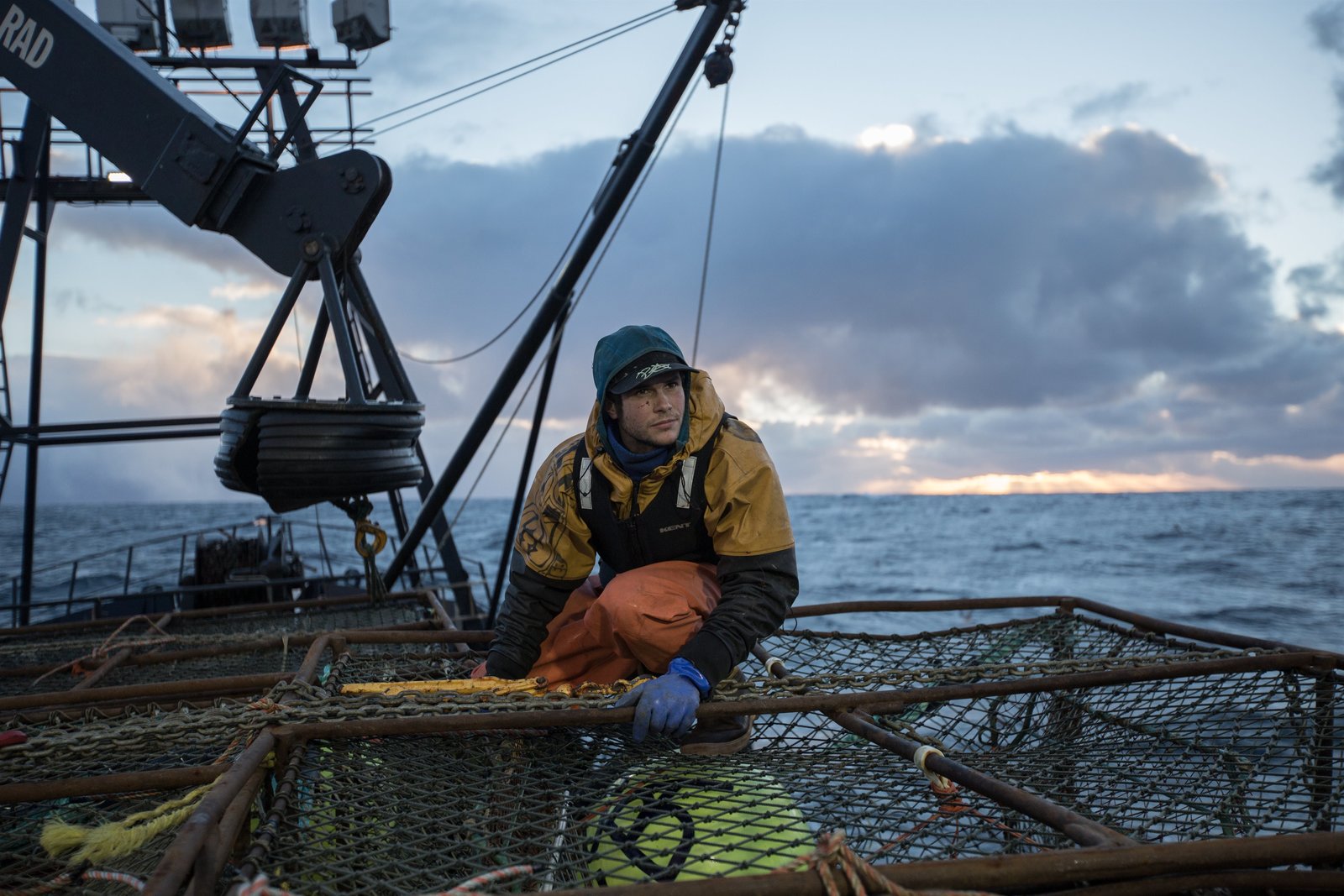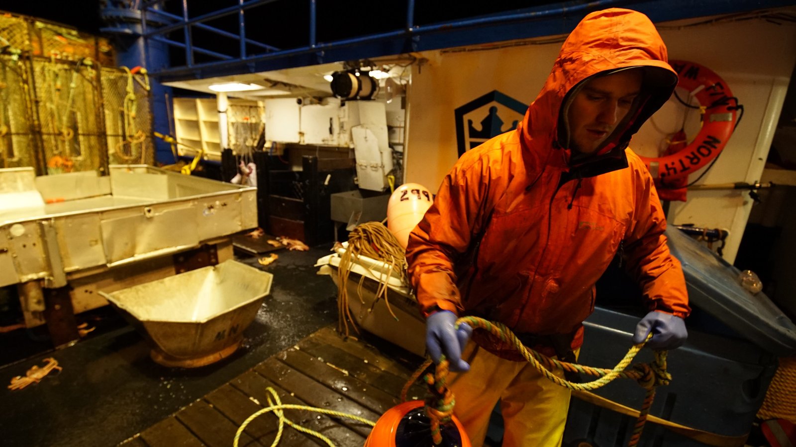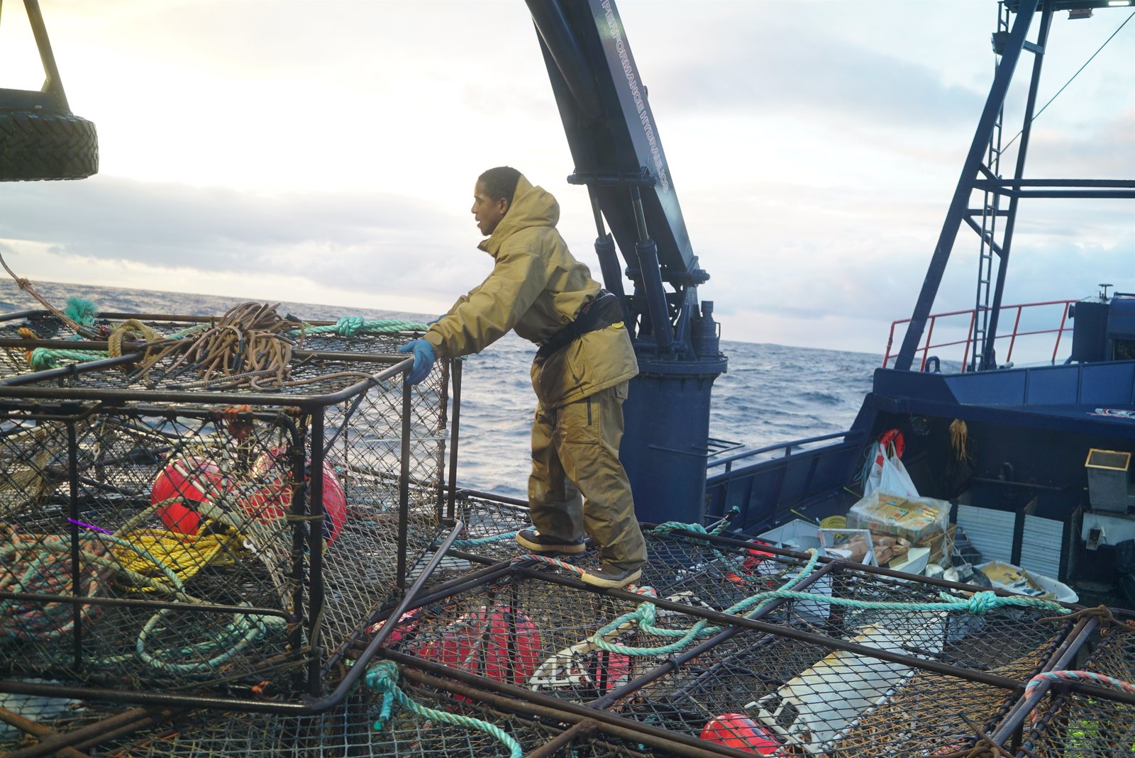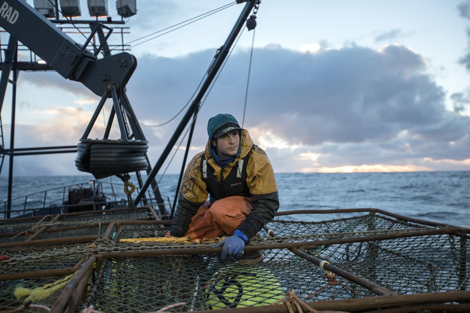 Feuertaufe in schwerer SeeJacob Hutchins, Deckhand on F/V Saga, stacks pots.Bild: © Discovery Communications