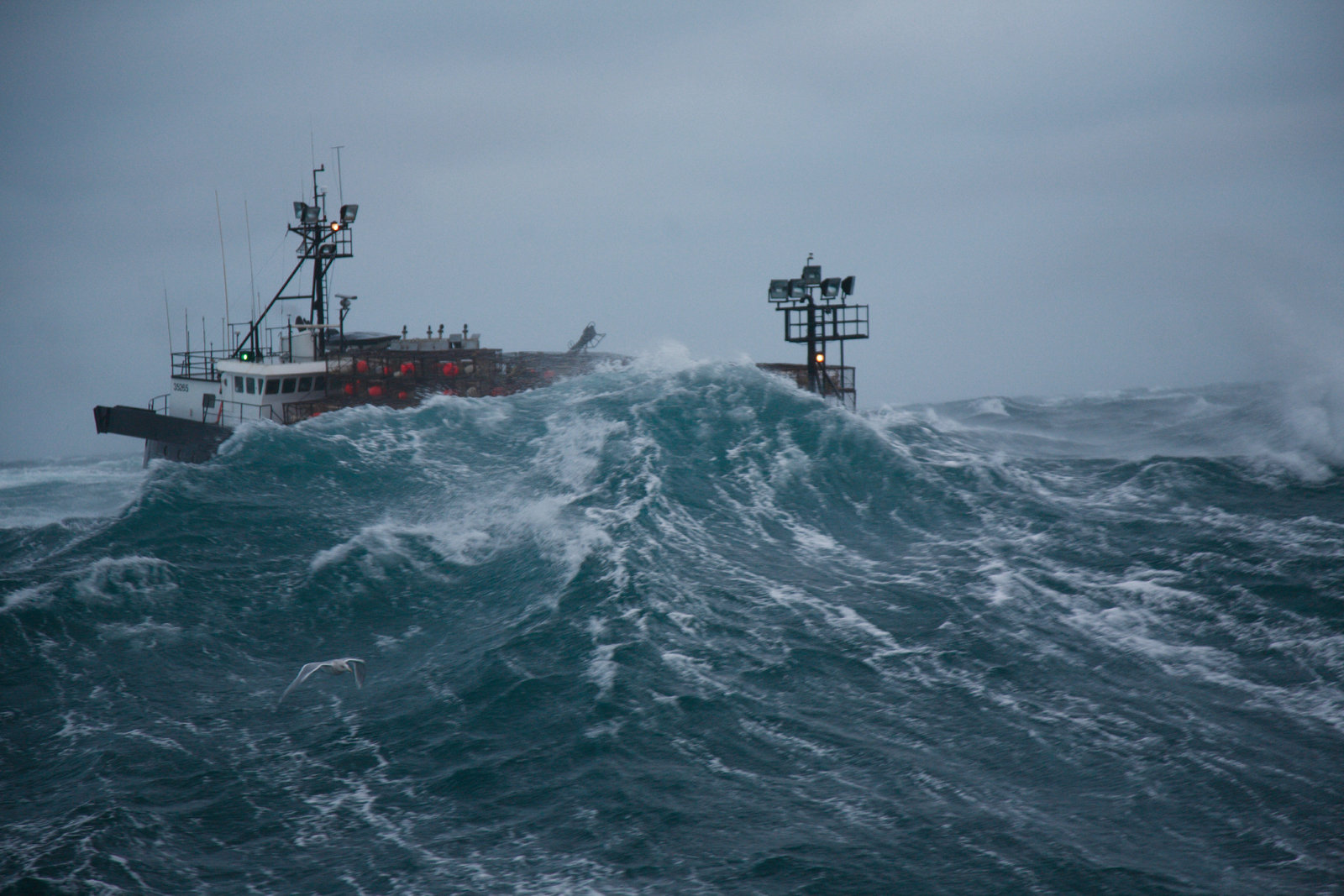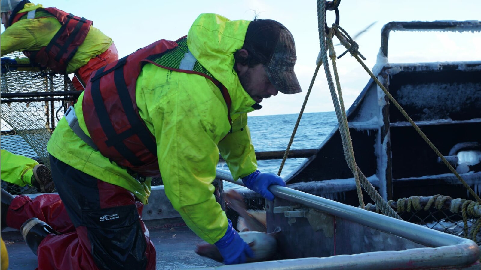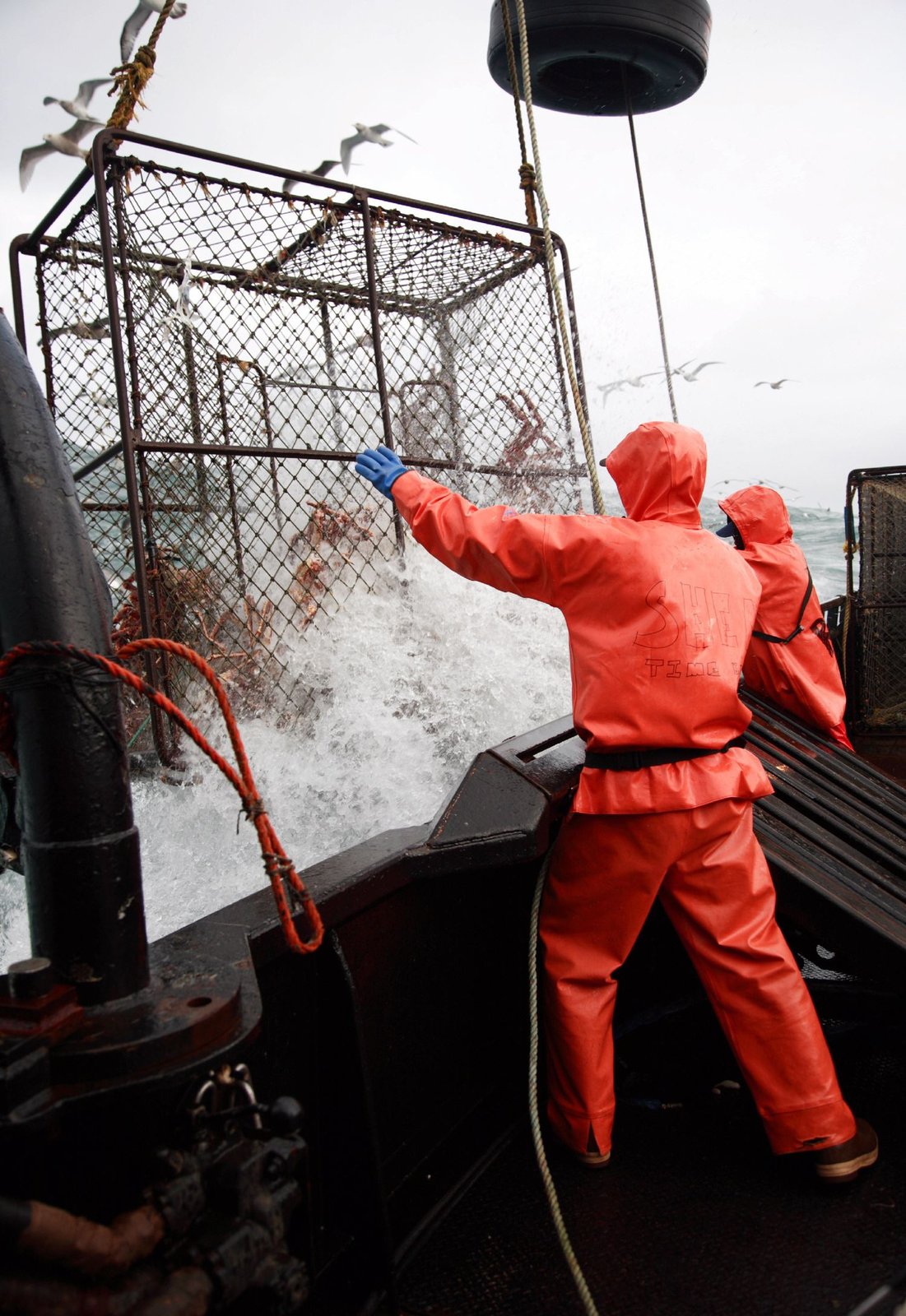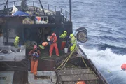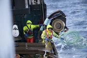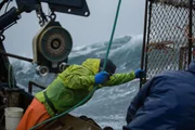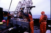Plötzlich KapitänDeckhands on the Brenna A struggle to get a pot on board before a rogue wave hits the deck.Bild: © Discovery Channel / Discovery Communications
