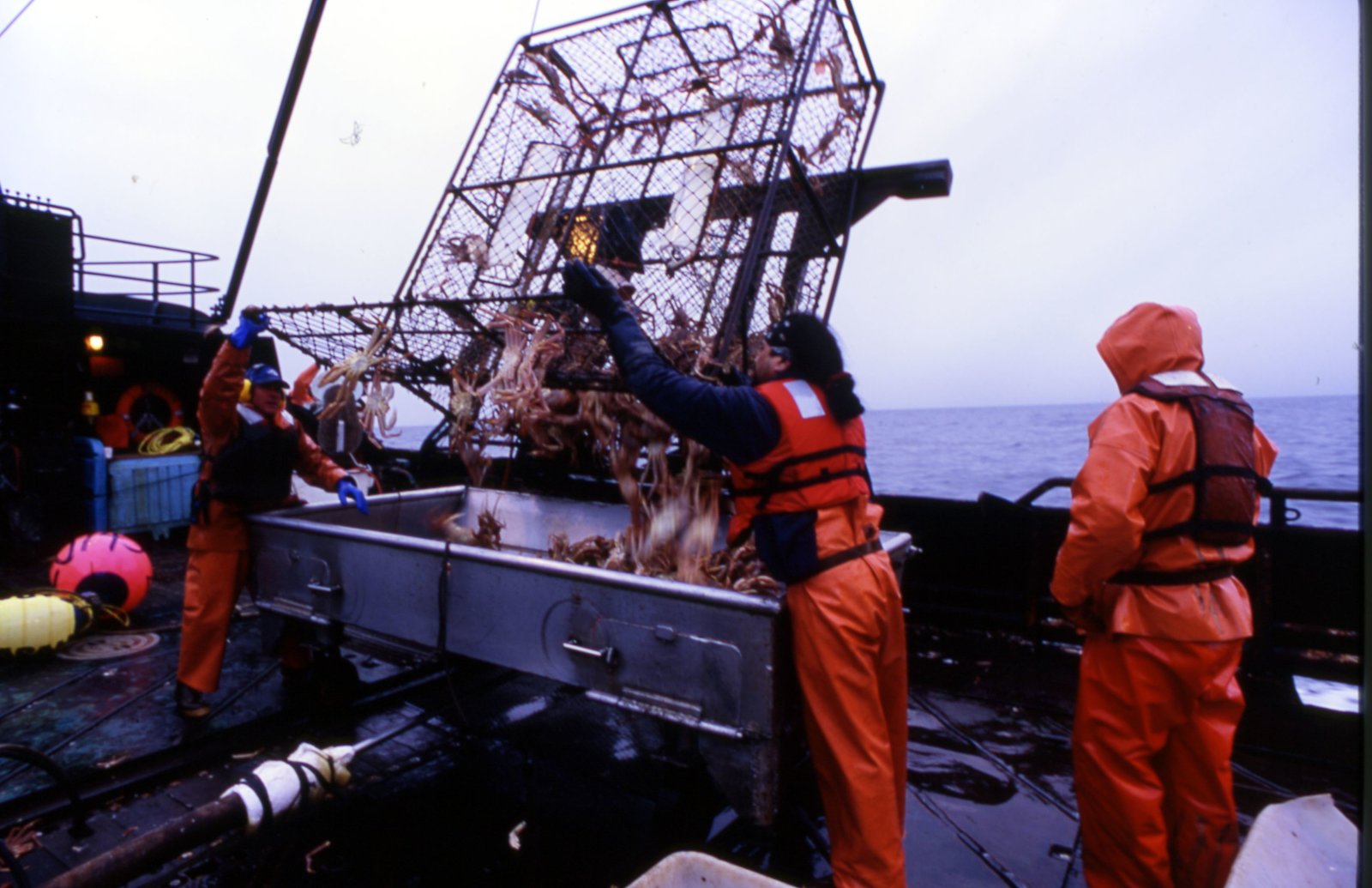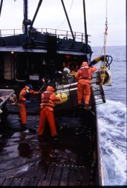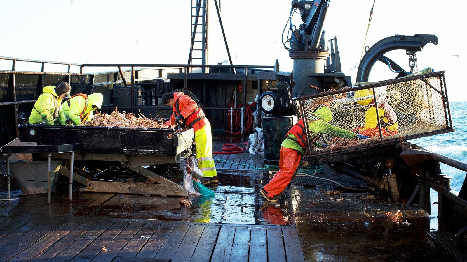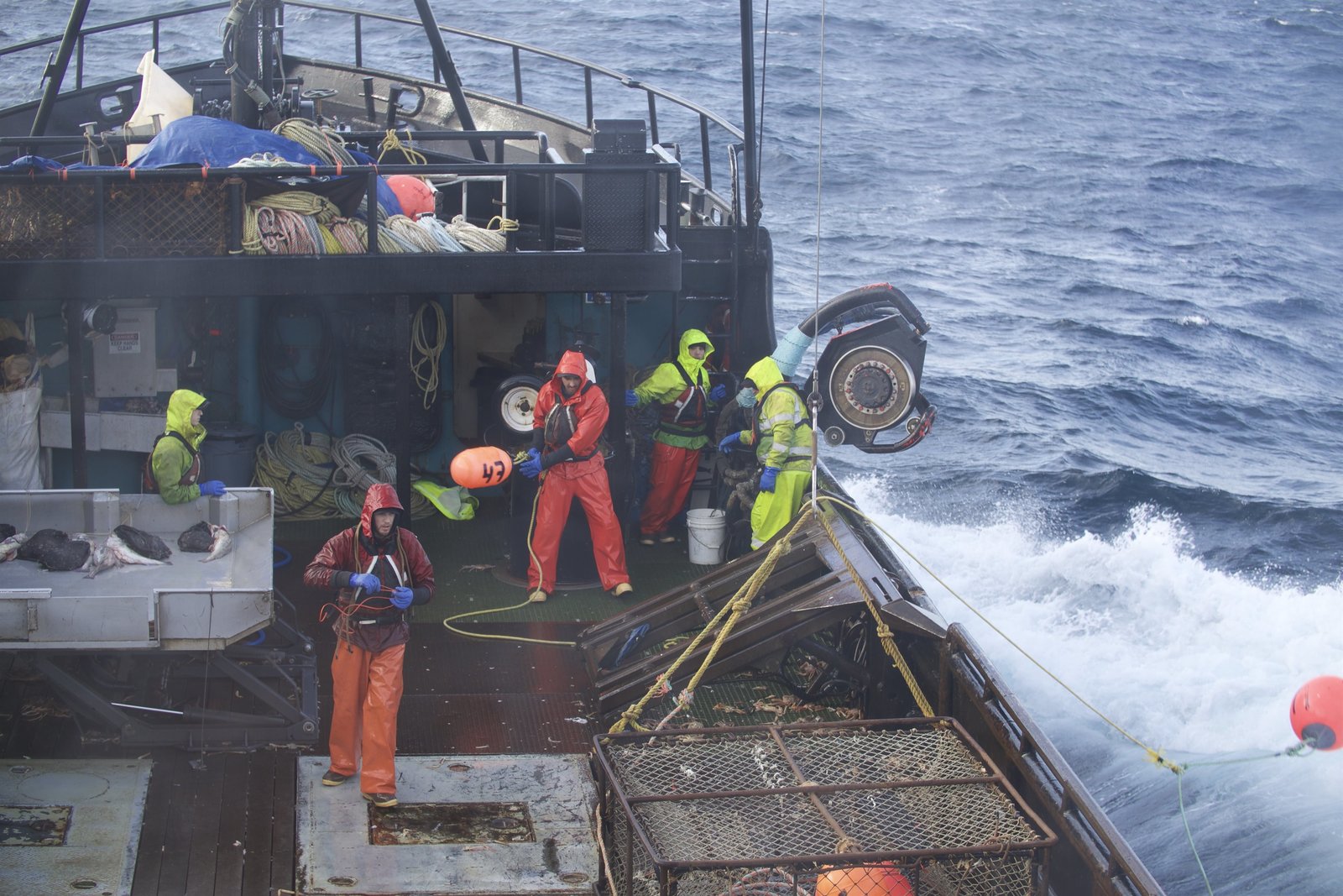 Sturz in die BeringseeStack-view of the deck - The crew aboard the Cornelia Marie post-pot drop, ready to throw buoys.Bild: © Discovery Communications / Discovery Channel