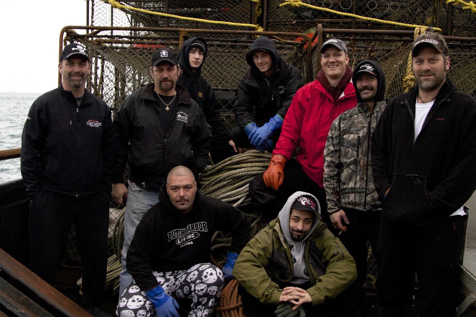 MotorschadenTime Bandit crew. (l-r) Captain Andy Hillstrand, Captain Johnathan Hillstrand, Eddie Uwekoolani Jr., Scott Hillstrand, Mike Fourtner, Neal Hillstrand, Travis Lofland. Foreground, left to right: Eddie Uwekoolani and Josh Harris.Bild: © Discovery Communications, Inc.