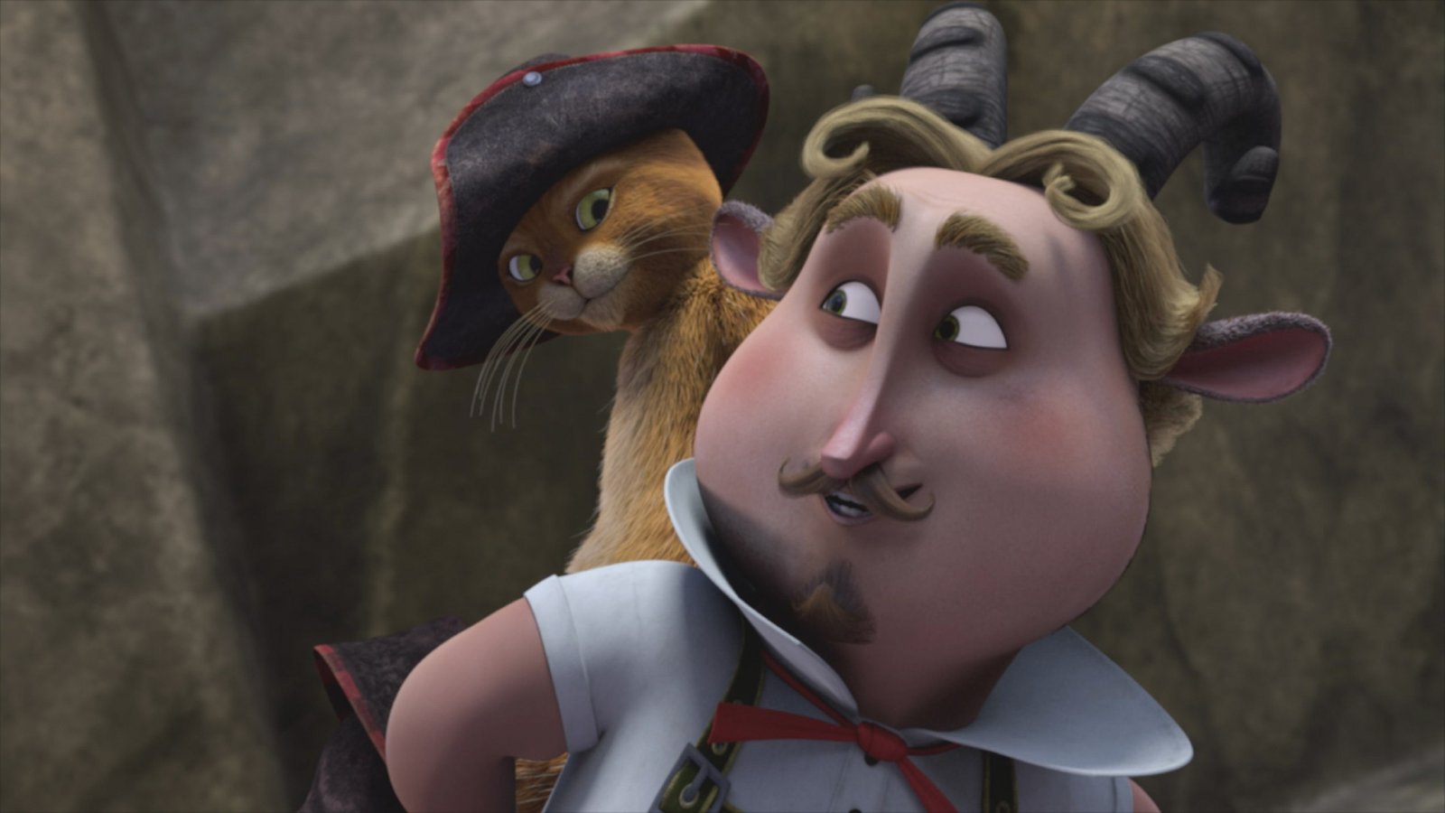 Der KrummsäbelZiegenmann Uli (r.) rettet den gestiefelten Kater, obwohl dieser ihn erst zurückgelassen hat.Bild: © DreamWorks Animation