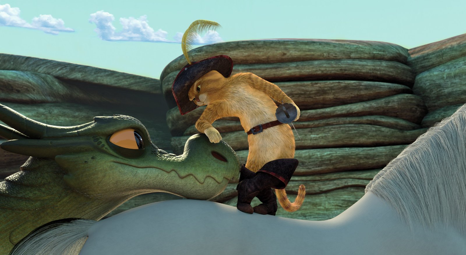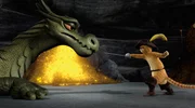 Kleiner DracheZunächst glaubt der gestiefelte Kater, dass er sich gegen den Drachen verteidigen muss. Doch er merkt schnell, dass dieser gar nicht gefährlich, sondern krank ist.Bild: © DreamWorks Animation