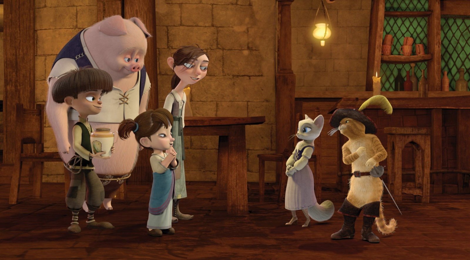 Helden-GeschichtenUm den Riesen abzulenken, erzählen die Waisenkinder Heldengeschichten vom gestiefelten Kater.Bild: © DreamWorks Animation
