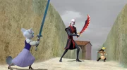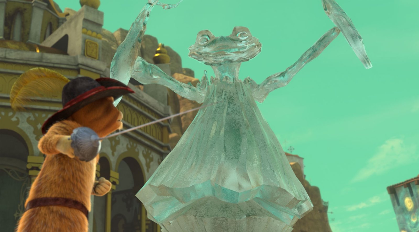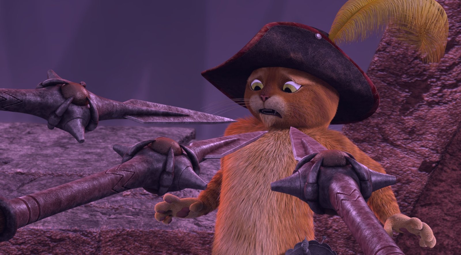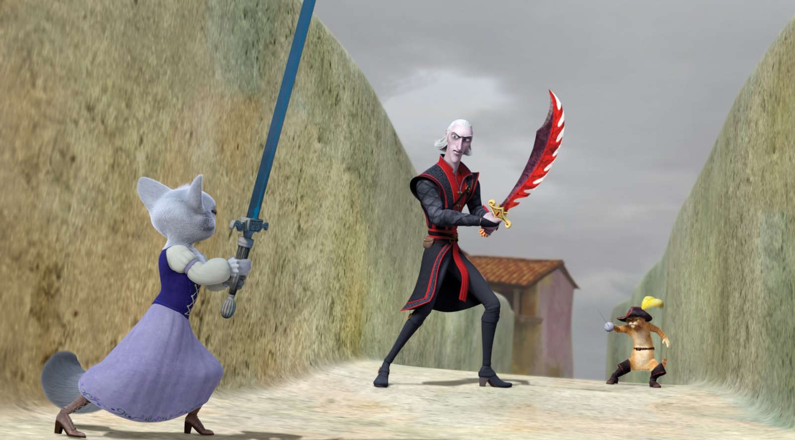 Das neue SchwertDulcinea stellt sich mutig dem bösen Fiesgrins. Doch sie muss den Schurken nicht alleine besiegen, denn der gestiefelte Kater steht ihr zur Seite.Bild: © DreamWorks Animation
