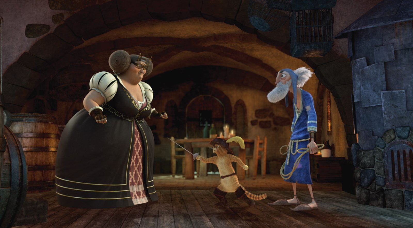 Die HerzoginDer gestiefelte Kater versucht die bösen Herzogin hinters Licht zu führen, um Artefius zu befreien.Bild: © DreamWorks Animation