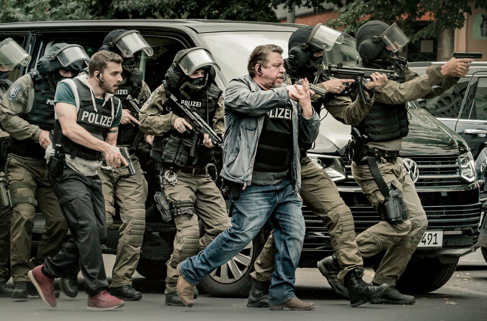 Friss oder stirbZugriff! Schulz (Armin Rohde) und das SEK rücken an, um eine Geiselnahme zu beenden.Bild: © arte