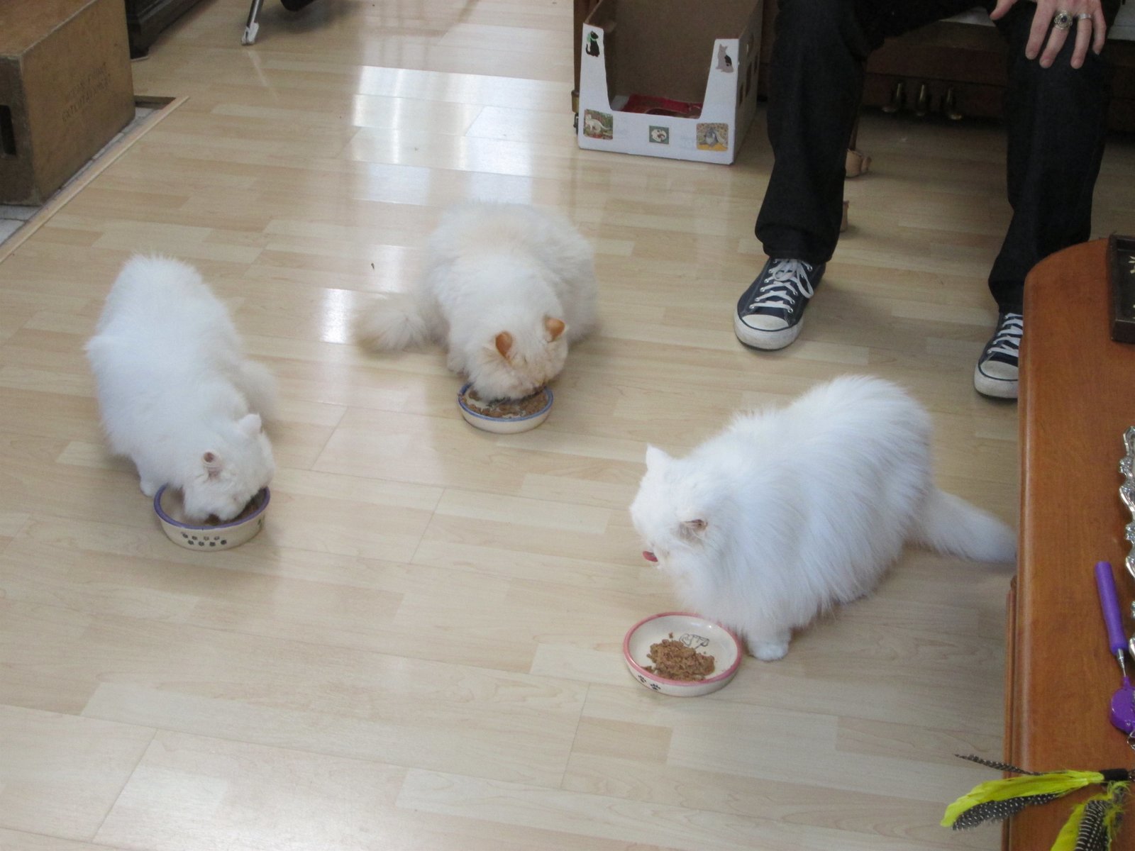 Wer ist hier verrückt?Bombadil the cat with two other cats while they eat.Bild: © Discovery Communications