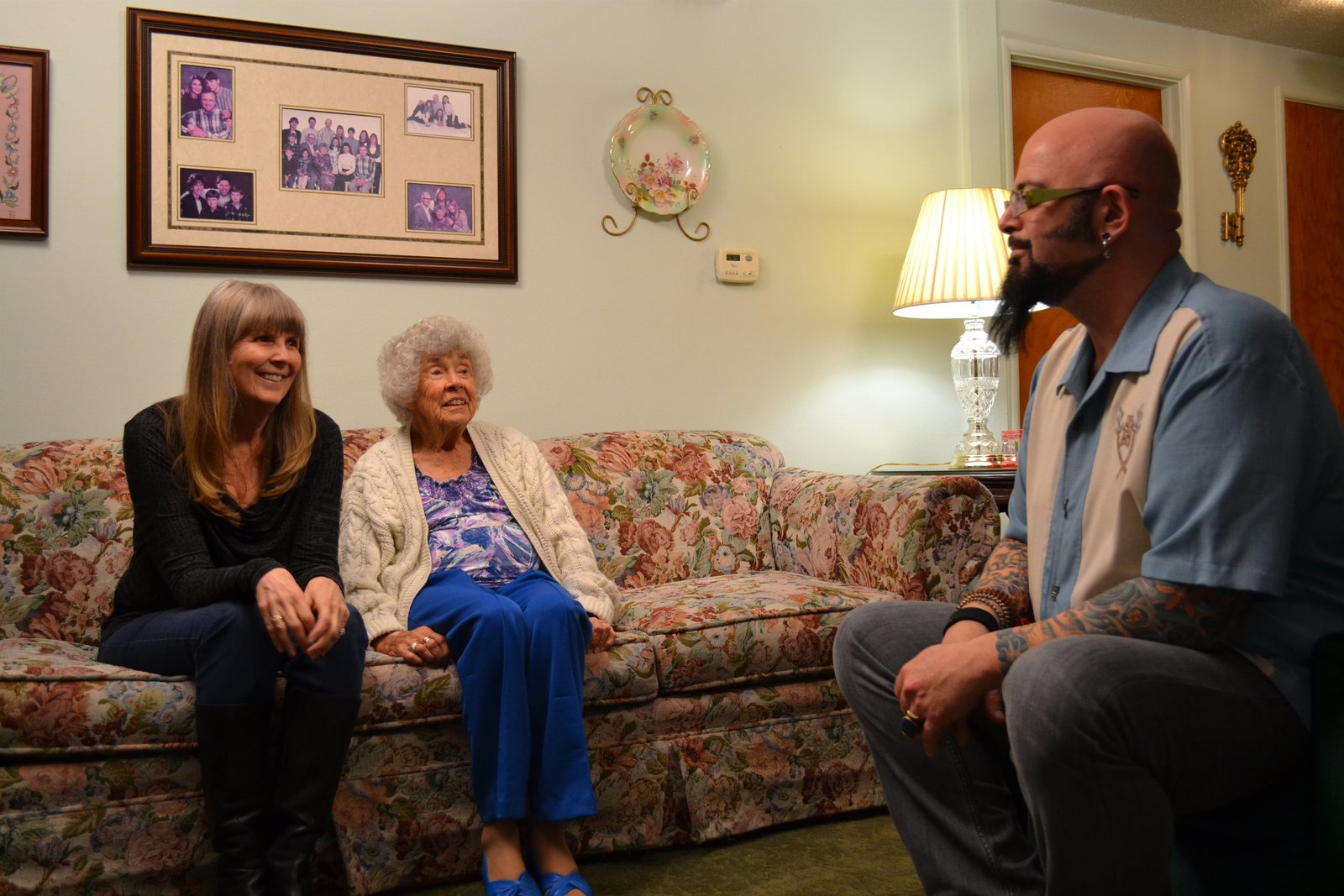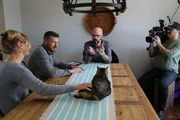Nightmare on Cat StreetJackson, Moran family, and crew member sitting at a table where Zachary is laying.Bild: © Animal Planet / Discovery Communications