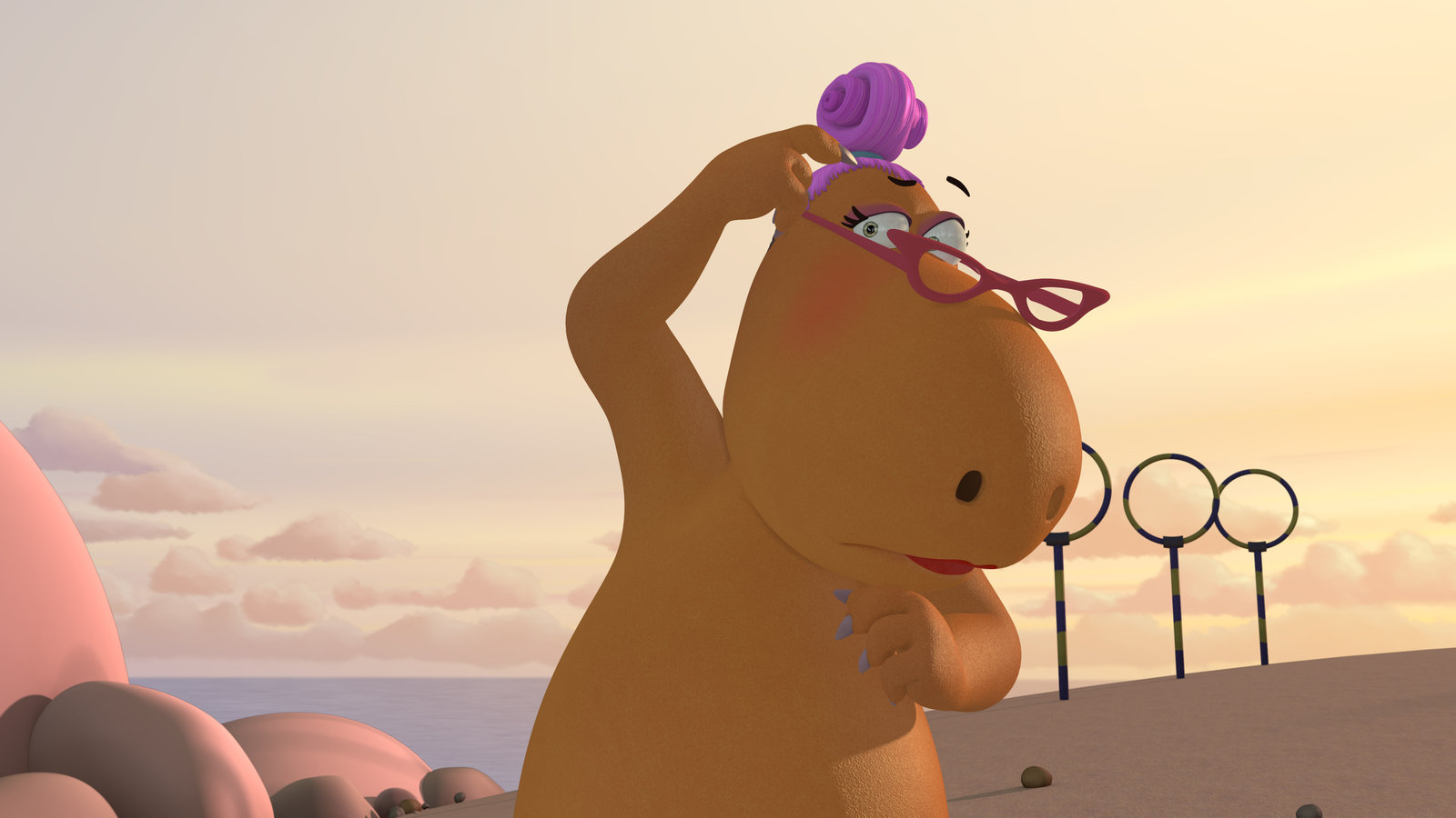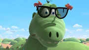 Der ZaubertrankDie Obstschwestern erklären sich bereit, den Riesendrachen Big Bo ein wenig herauszuputzen. Dazu gehört selbstverständlich auch eine modische Brille.Bild: © ZDF/Caligari Film