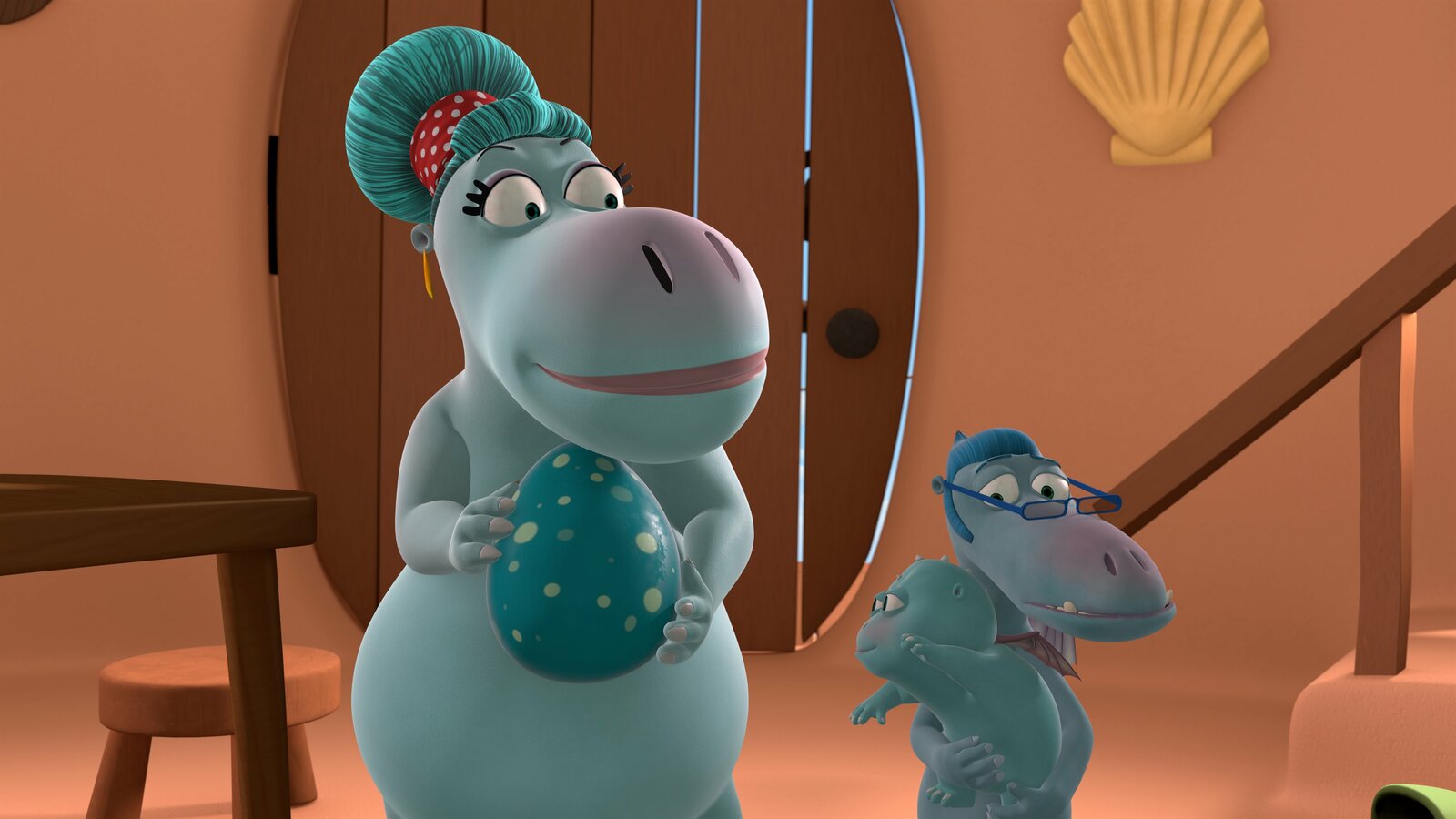 Der SimulantFamilie Klaue bittet Mette und Kokosnuss auf das Baby und das Ei aufzupassen.Bild: © ZDF/Caligari Film