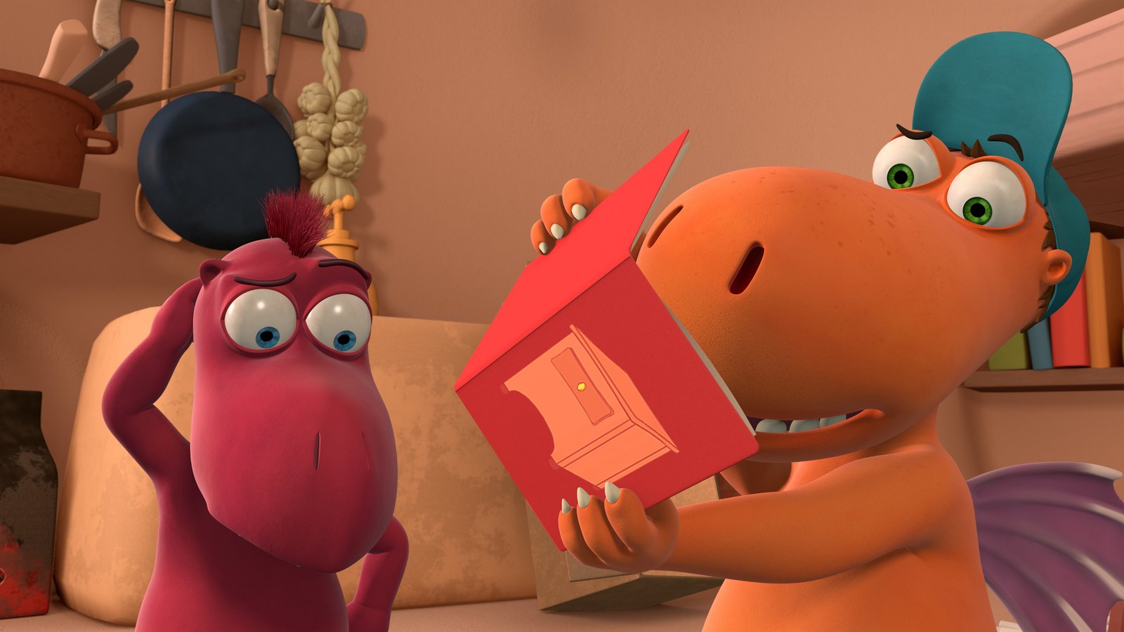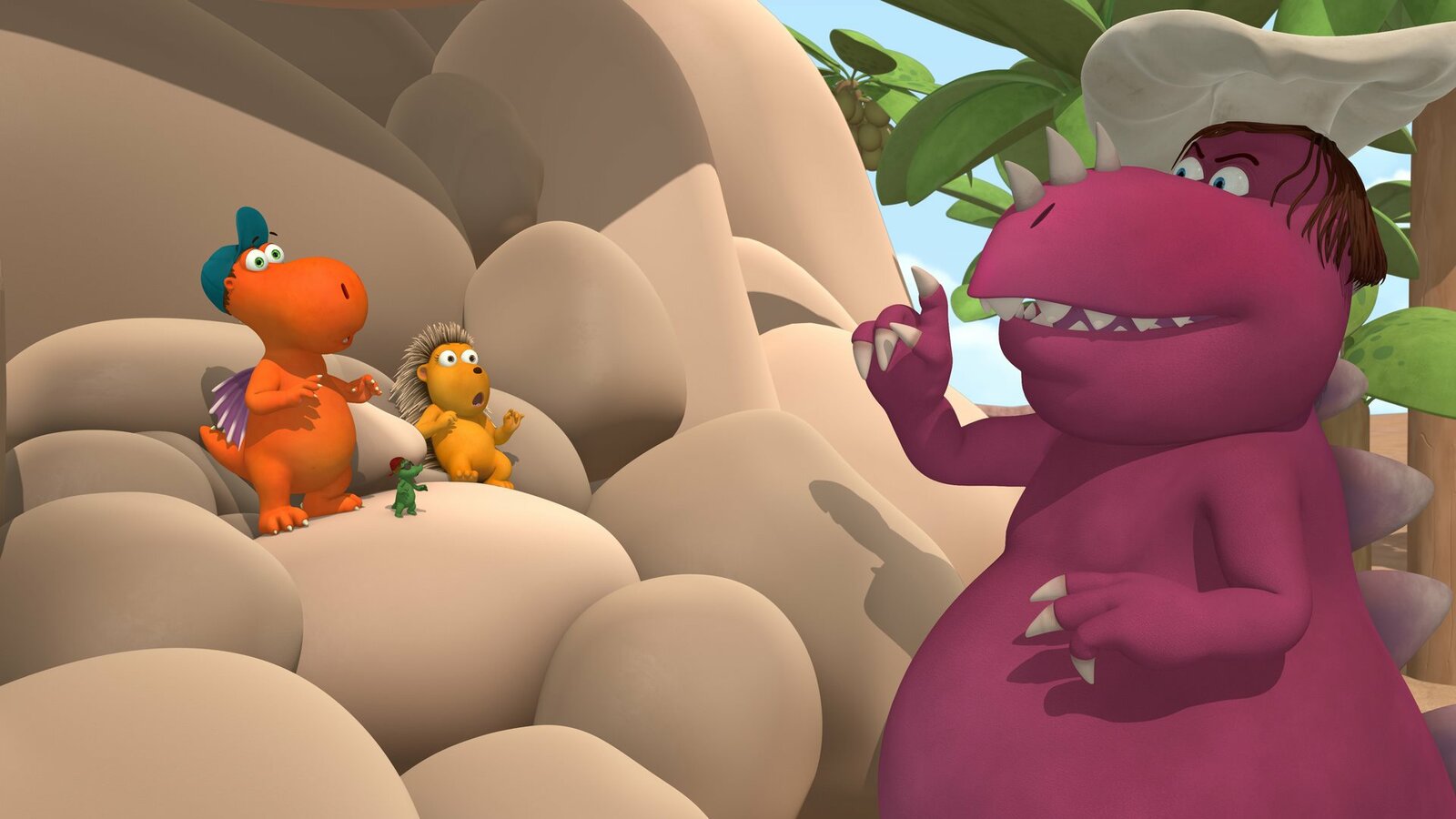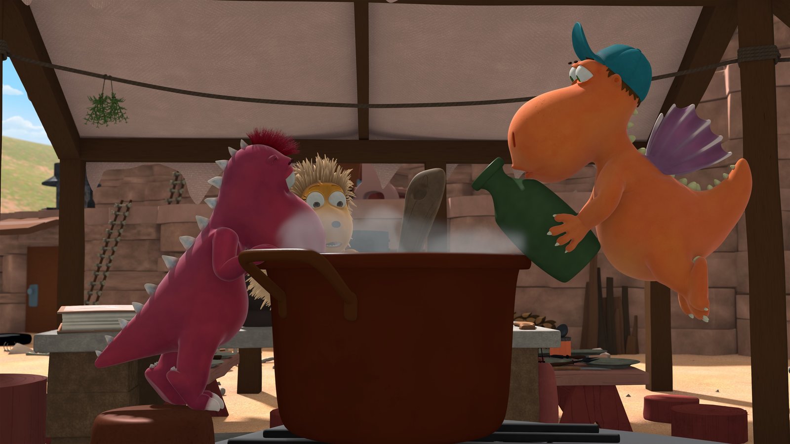 DrachenhungerWeil Chef im Urlaub ist, müssen Kokosnuss, Oskar und Matilda die Fressdrachen bekochen.Bild: © ZDF/Caligari Film