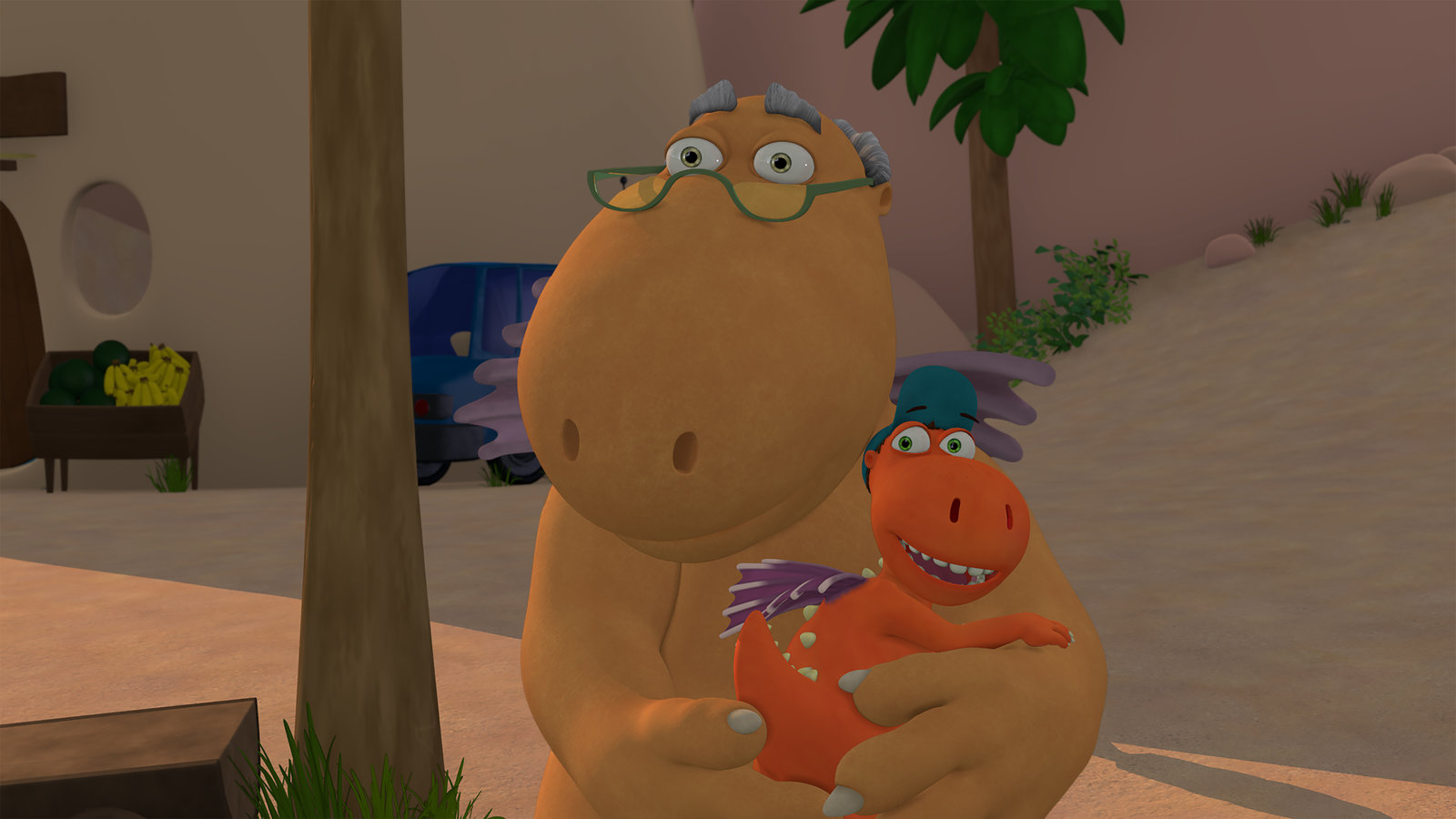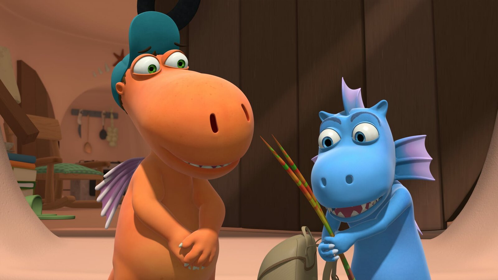 Das Lied der DrachenWokki hat seinen Freund Kokosnuss zu Hause besucht und freut sich sehr über etwas Feuergras als Abschiedsgeschenk.Bild: © ZDF/Caligari Film