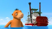 Amadeus in GefahrAmadeus, der riesige Meeresdrache, ist neugierig, was Chef, der mit einem Schiff angereist ist, wohl von ihm will.Bild: © ZDF/Caligari Film