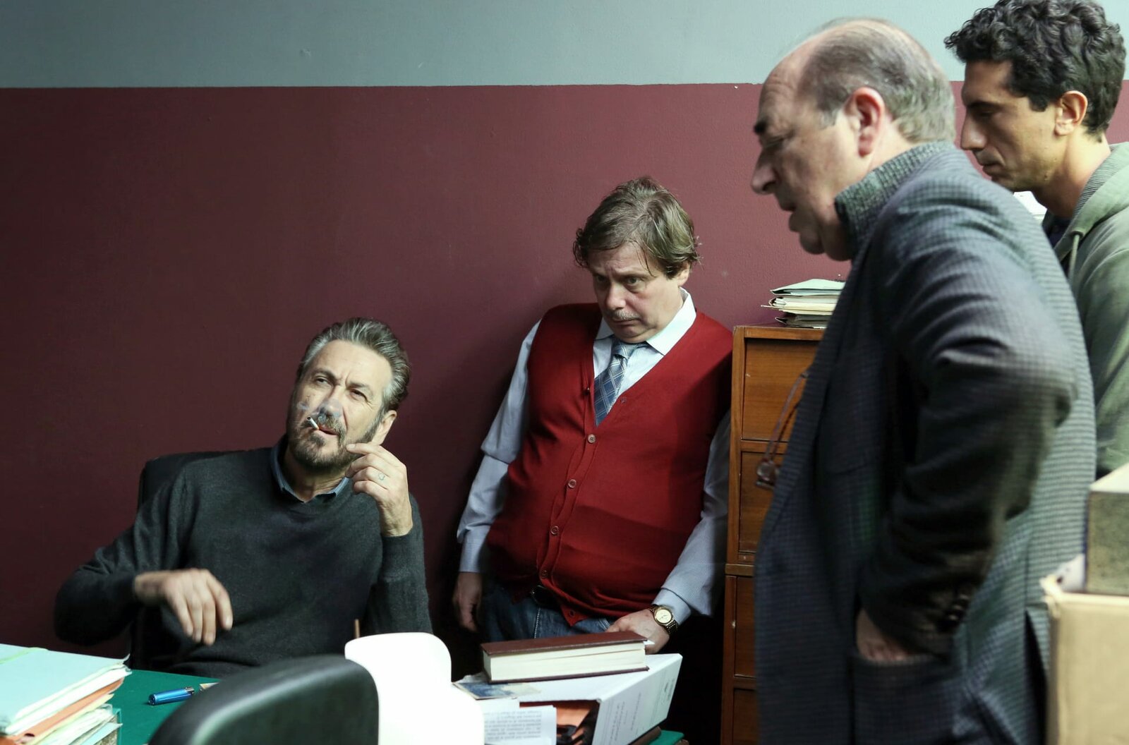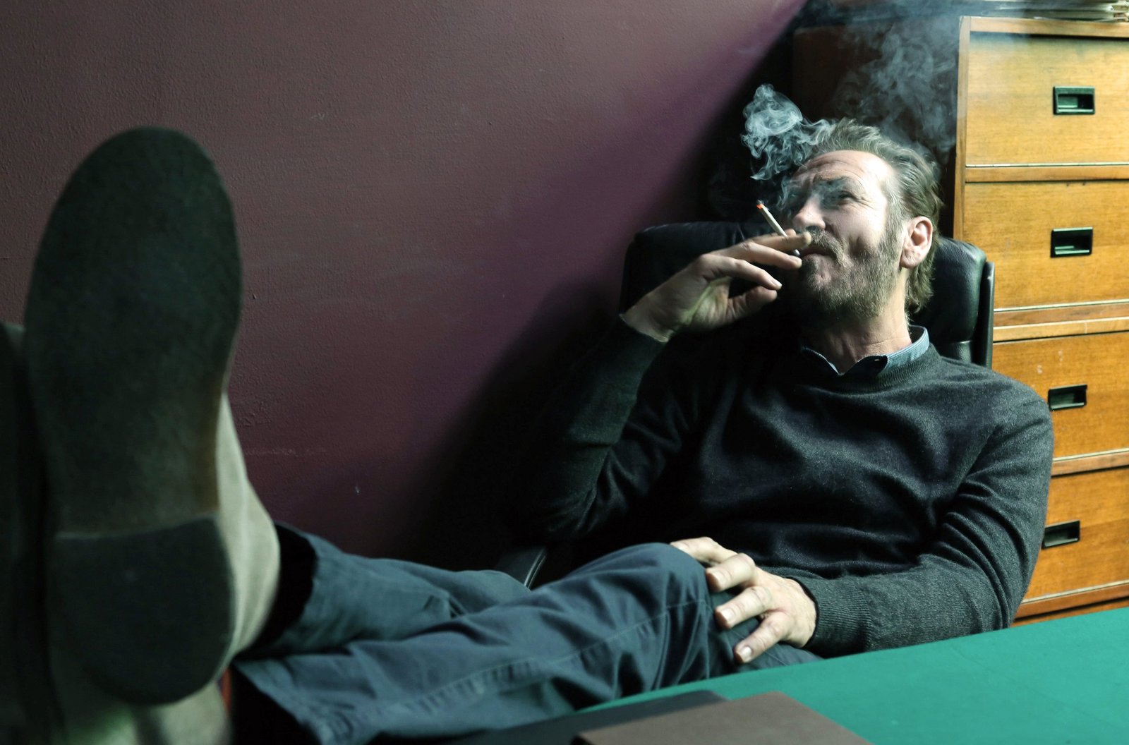 Staub und SchattenRocco Schiavone (Marco Giallini) bei seiner Lieblingsbeschäftigung: Kiffen im Büro.Bild: © ARD Degeto
