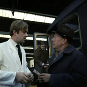 2. "Ich glaube, ich habe den Mann gesehen!" Der Kellner Ahrens (Martin Lüttge, li.) bringt Kommissar Keller (Eric Ode, re.) auf eine mögliche Spur. Keller weiß jetzt, dass einer der Hauptverdächtigen entgegen seiner eigenen Aussage doch in der fraglichen Nacht den Zug nach München benutzt hat.