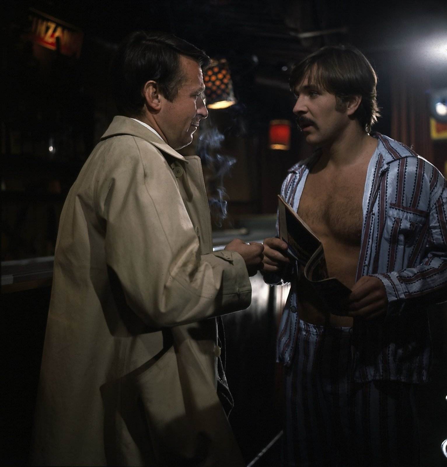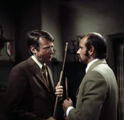 Der Billardspieler namens Rosse (Klaus Löwitsch, r.) hat sich verdächtig gemacht. Grabert (Günther Schramm, l.) versucht, ihn an der Flucht zu hindern.