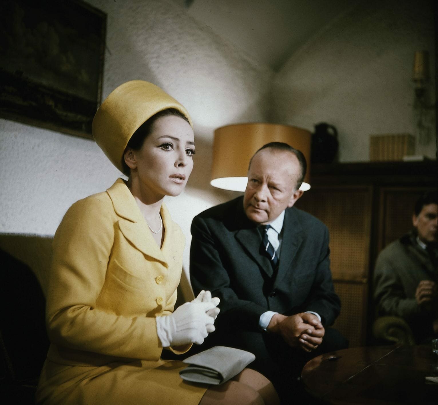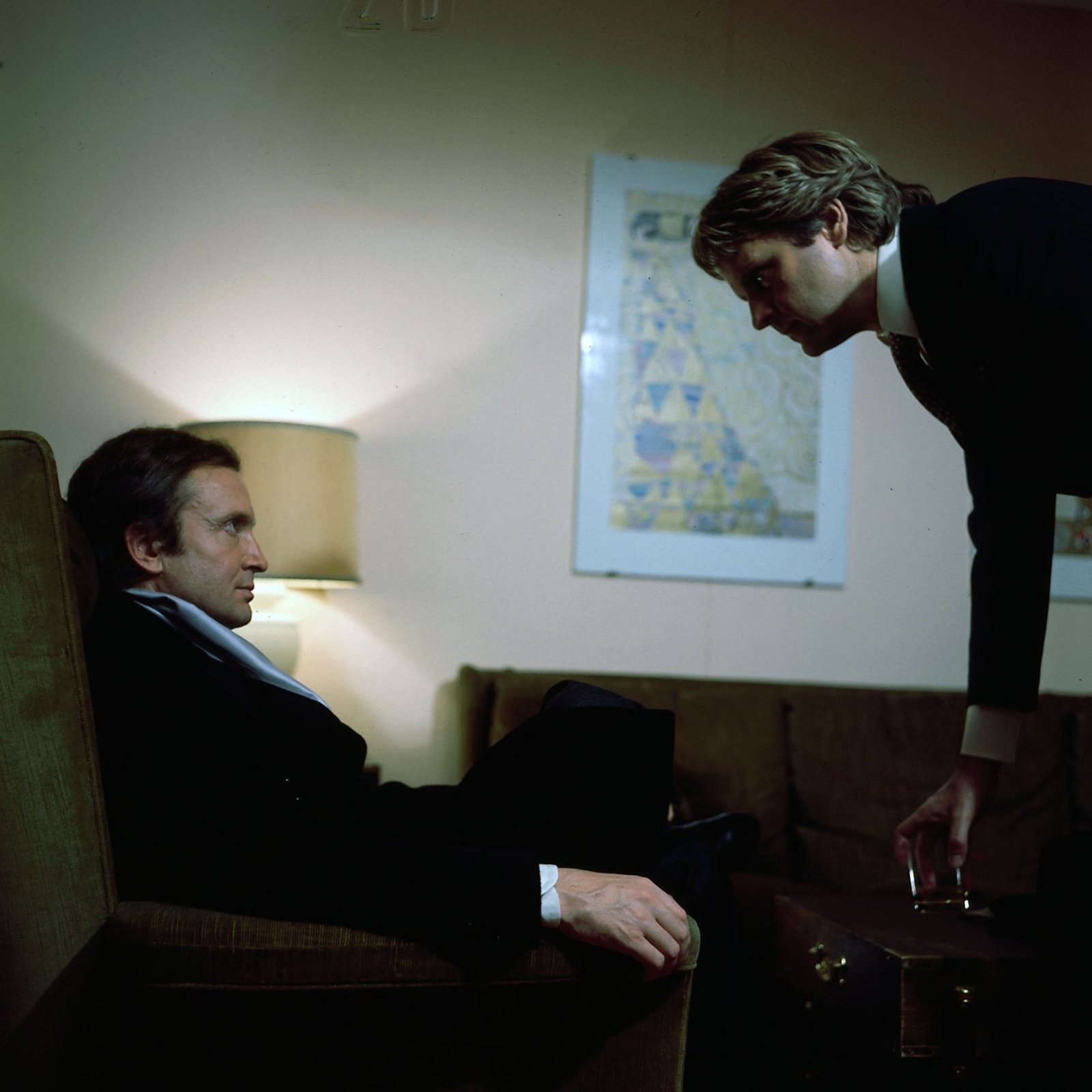 Mit übertriebener Herzlichkeit begrüssen sich Grabert (Günther Schramm, l.) und Karass (Götz George, r.), obwohl eine instinktive Abneigung zwischen den beiden Männern besteht.