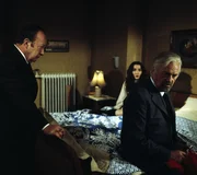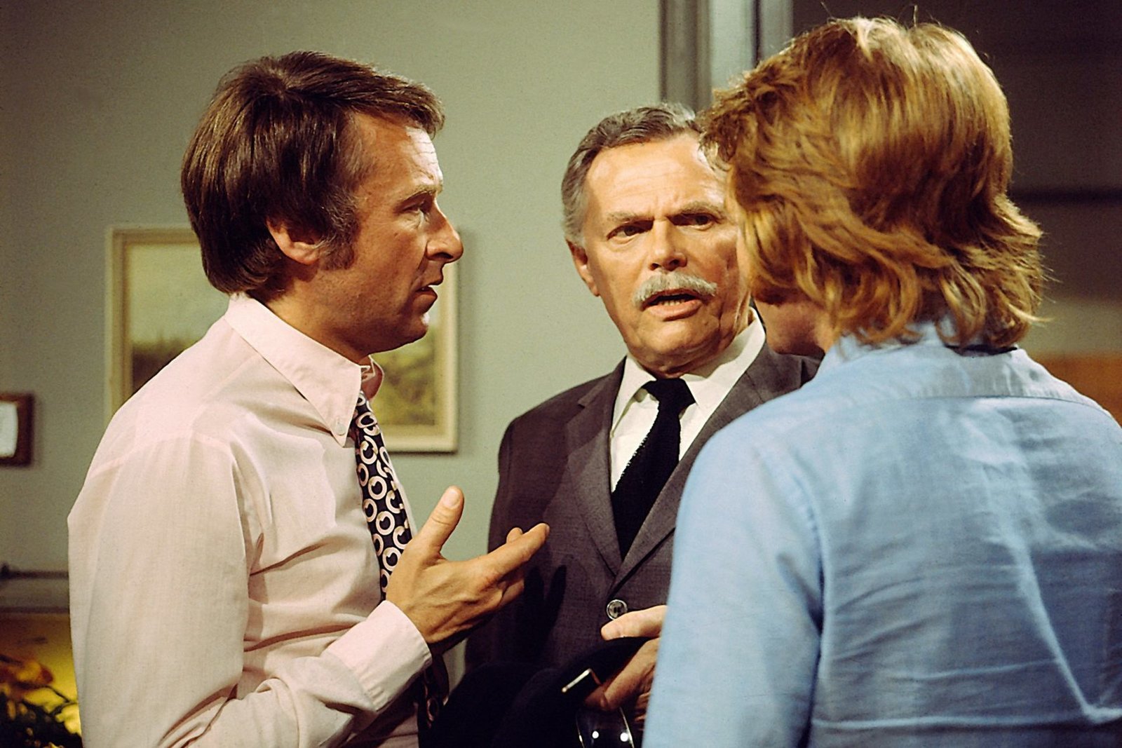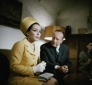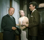 Nur eine einzige Devise beherrscht alle Beteiligten: Nicht die Nerven verlieren, denn das könnte dem unbekannten Mörder seine Chance geben! Eva Rassner (Christine Kaufmann, M.) droht unter dem Druck der Ereignisse schlapp zu machen. Deshalb bittet der Kommissar (Erik Ode, l.) Dr. Hochstätter (Curd Jürgens, r.) um ärztliche Hilfe für sie.
