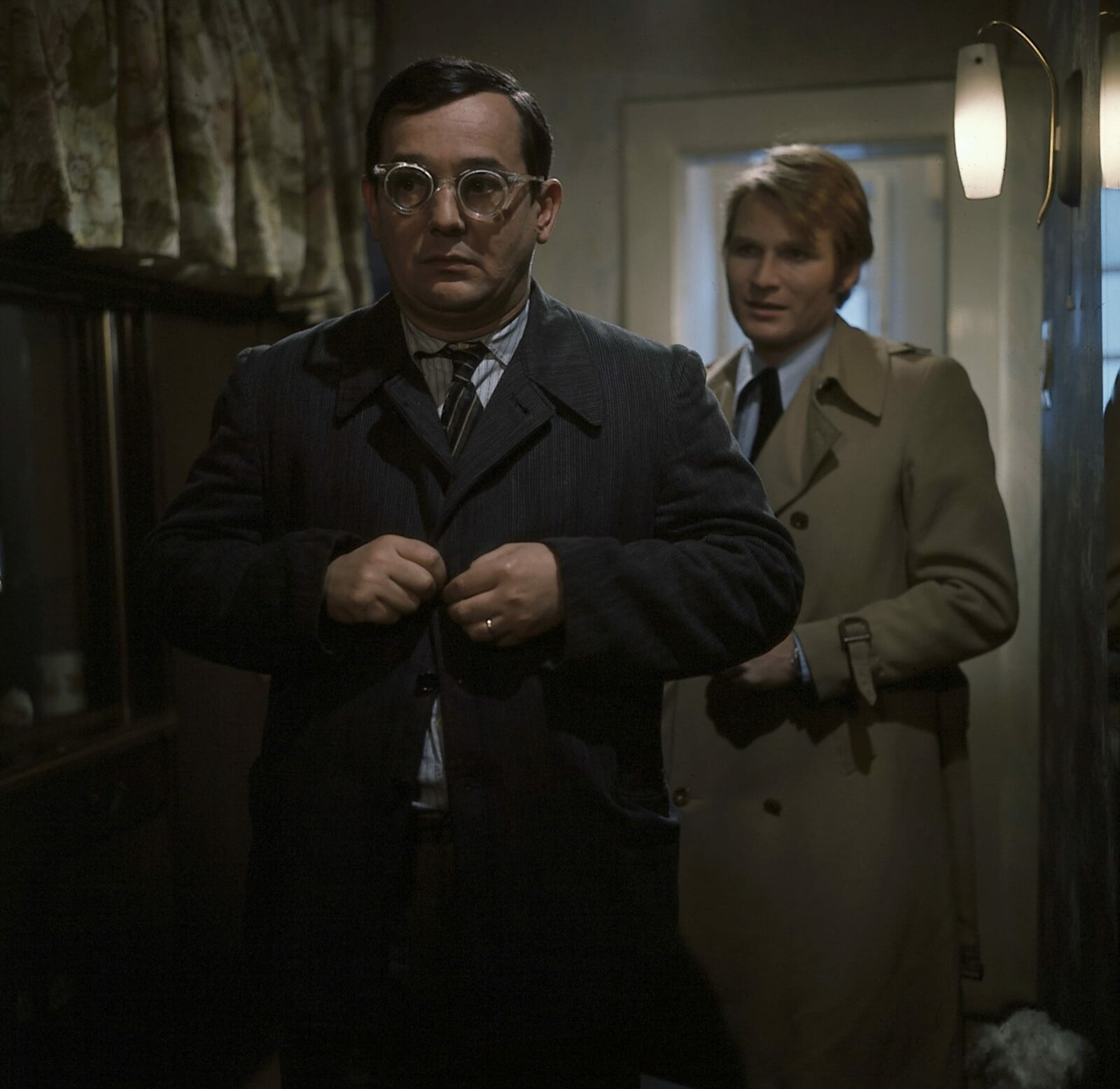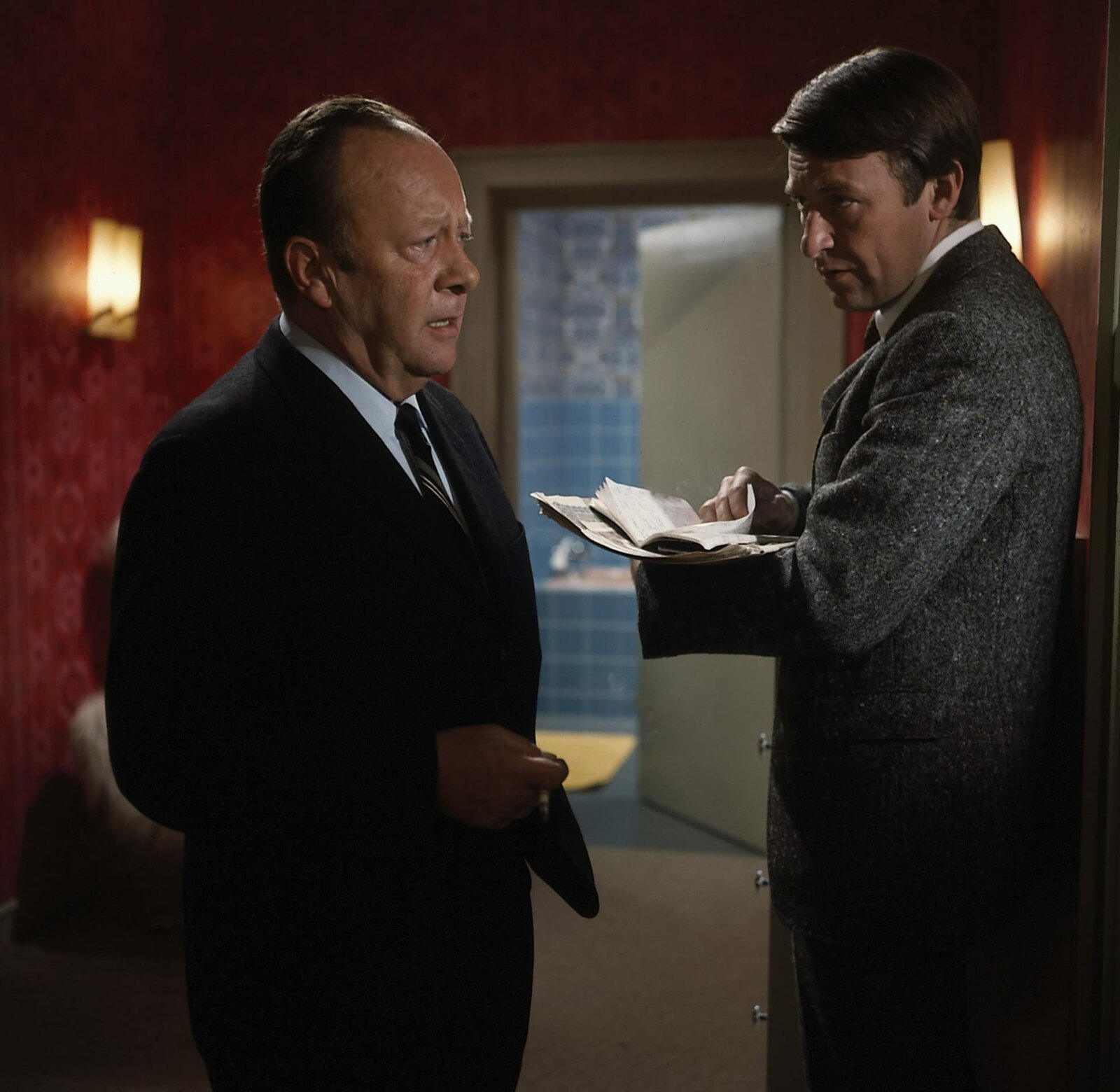 Kommissar Keller (Erik Ode, l.) hat den gelähmten Höfer (Werner Bruhns, v.) aus dem Nachbarhaus holen lassen. Vielleicht erkennt dieser Mann unter den eingetroffenen Besuchern den Mörder.