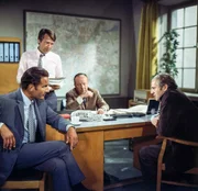 Die kleine SchubelikMit Pölich (Josef Fröhlich, r.) hatte Schubelik am Abend getrunken, bevor man ihn am nächsten Morgen tot auffand. Doch im Verhör leugnet Pölich standhaft, irgendetwas mit dem Mord zu tun zu haben. Die Kommissare Heines (Reinhard Glemnitz), Grabert (Günther Schramm), Keller (Erik Ode).Bild: © ORF