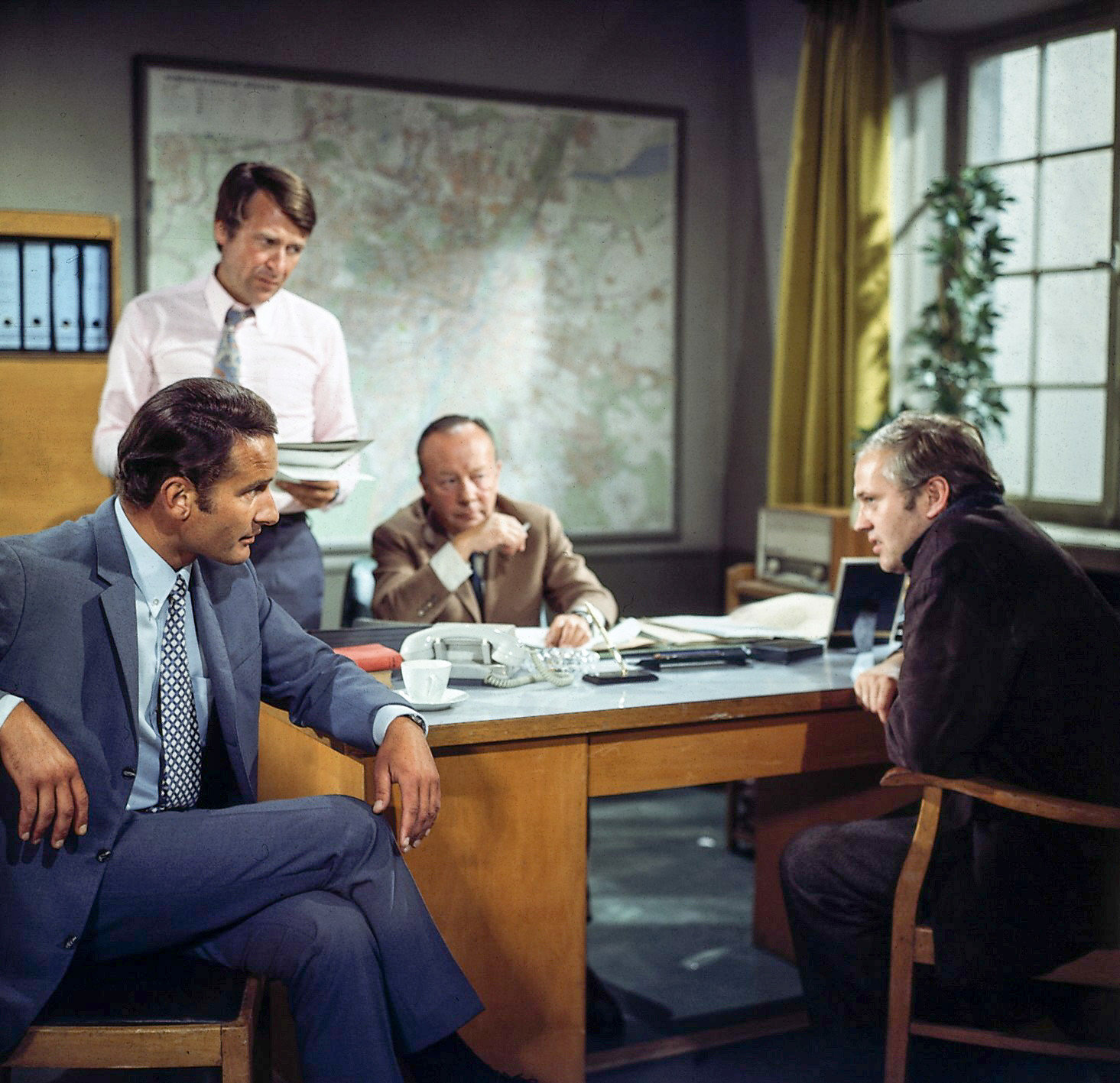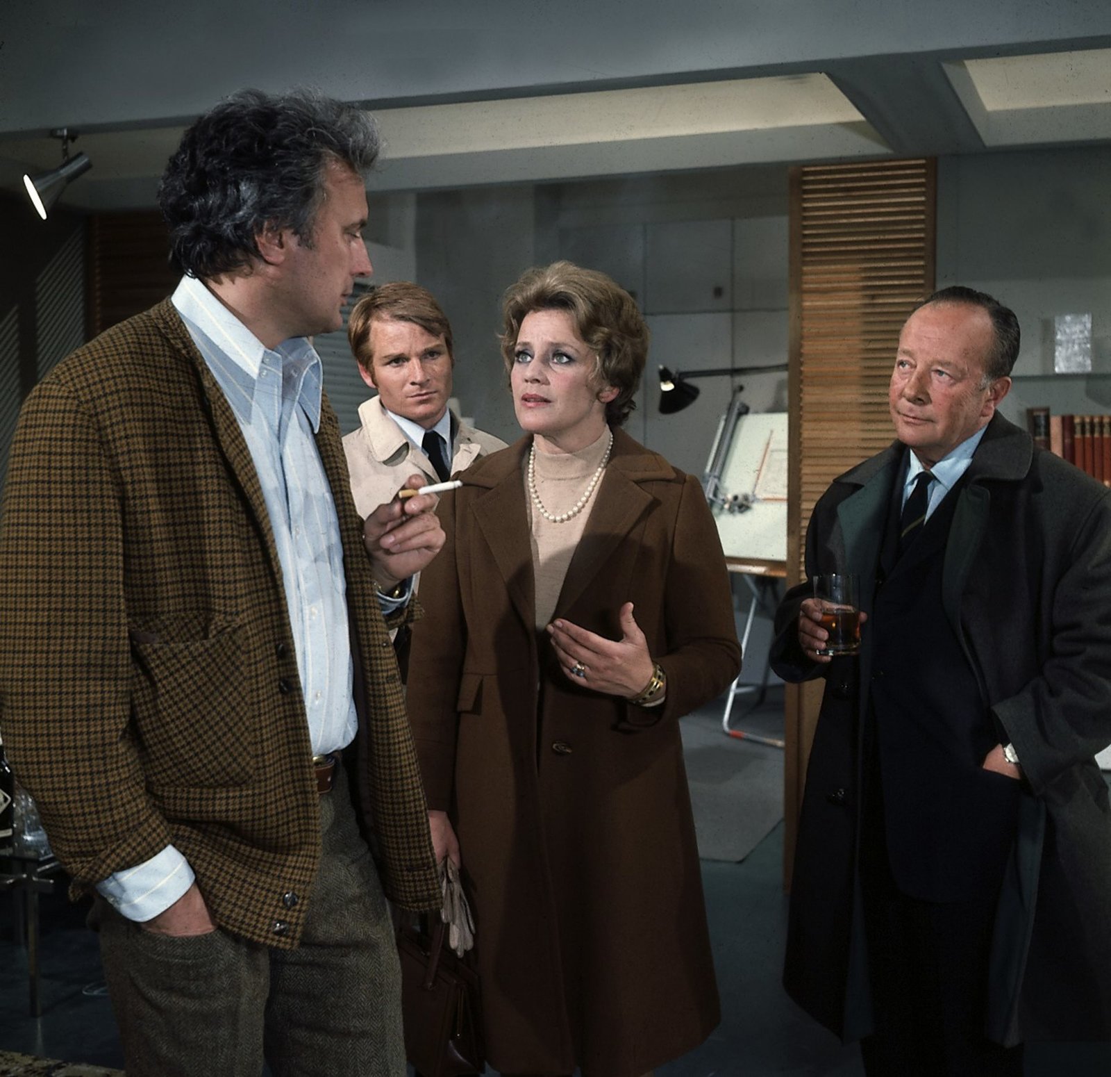 Schrei vor dem FensterIn der Wohnung von Steinbergs bekommt Kommissar Keller (Erik Ode, r.) einen überraschenden Eindruck von dem Ermordeten. Gerd Steinberg (Veit Relin, l.) sagt unverblümt seine Meinung. Harry Klein (Fritz Wepper, 2.v.l.) beobachtet die Reaktion Irene Paulis (Maria Schell, 2.v.r.). Die Aussagen Steinbergs geben ihm zu denken.Bild: © ZDF und Michael Marhoffer.