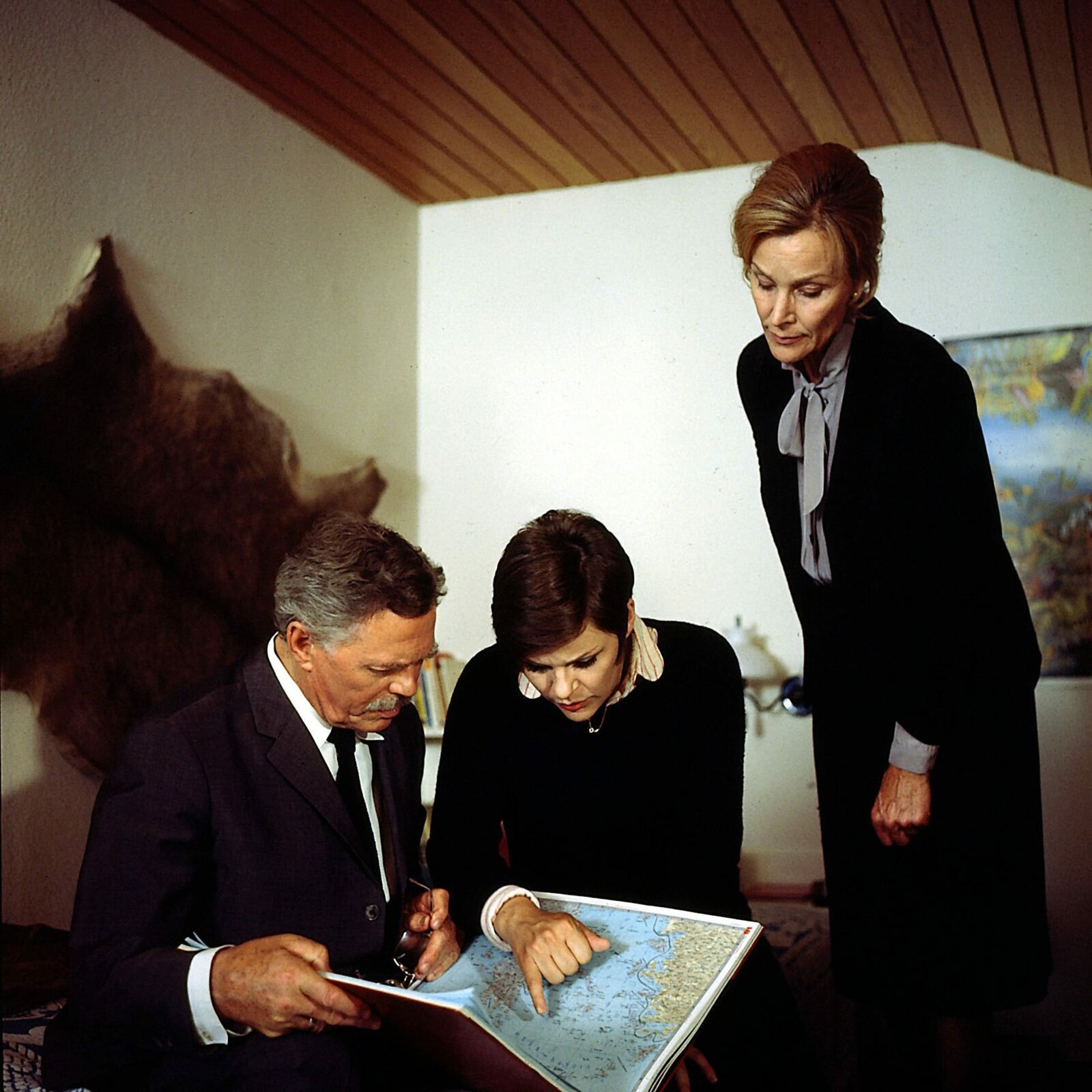 MykonosDie griechische Insel Mykonos ist für das Ehepaar Kerk kein Begriff. Erst auf der Landkarte müssen sie sich zeigen lassen, wo dieses Hippieparadies liegt. (Karl John, Maresa Hörbiger, Irmgard Först).Bild: © ZDF und Neue Münchner Fernsehproduktion.
