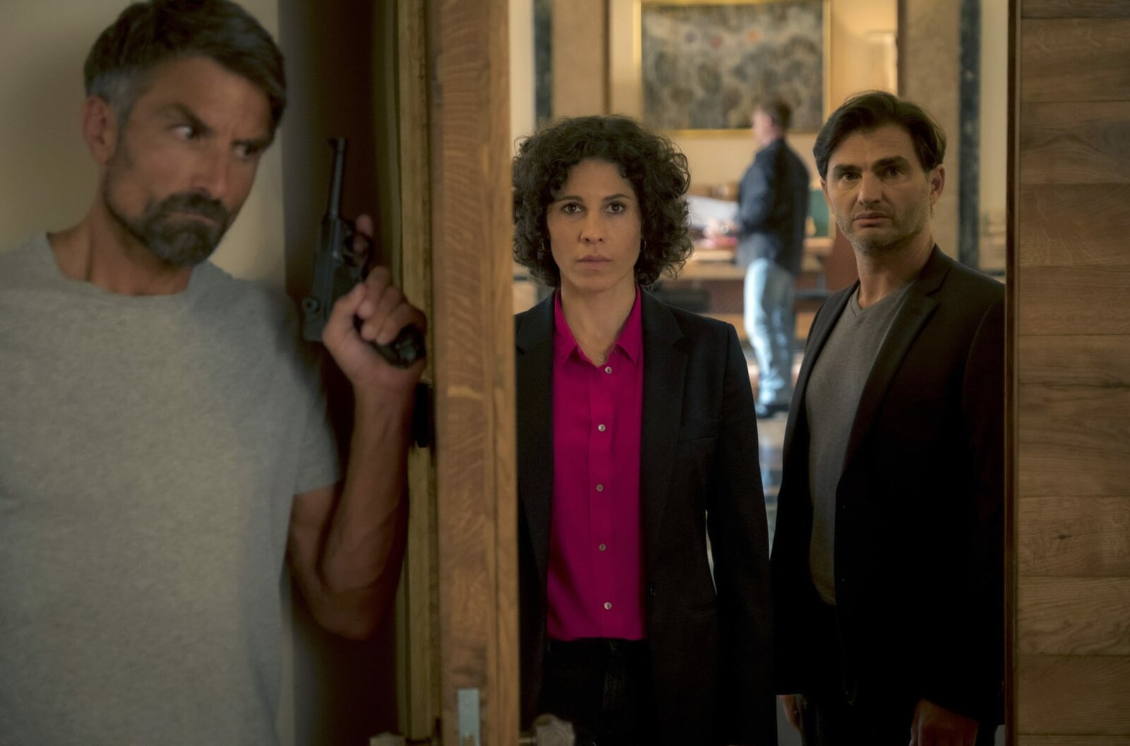 Tod einer LegendeBranka Mari? (Neda Rahmanian) und ihr Kollege Emil Perica (Lenn Kudrjawizki, li.) vernehmen den einflussreichen Dragan Trevi? (Miroslav Nemec), aus dessen Safe die Tatwaffe stammt.Bild: © ARD Degeto/Erika Hauri