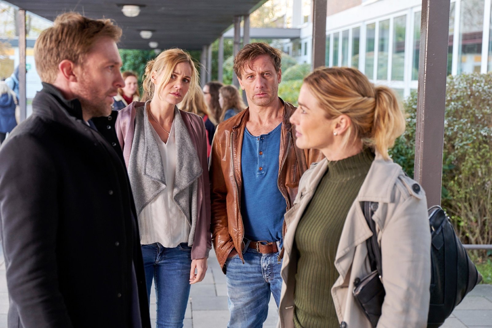 Sie mieser... SchuftStefan (Hendrik Duryn, 2.v.r.) und Karin (Jessica Ginkel, 2.v.l.) verabschieden Lucca (Janina Fautz) und Jan (Gerrit Klein) vor dem Sekretariat. Wie soll es mit Karin und Stefan weitergehen?Bild: © RTL / Frank Dicks / Sony P
