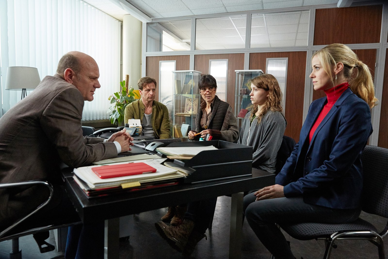 Sie mieser... SchuftGespräch mit Frau Heusner (Berivan Kaya, M.) von der Vormundschaft in Direktor Roses (Uli Gebauer, l.) Büro: Stefan Vollmer (Hendrik Duryn) und Karin (Jessica Ginkel, r.) stehen Schülerin Lucca (Janina Fautz) jedoch bei.Bild: © RTL / Frank Dicks / Sony P