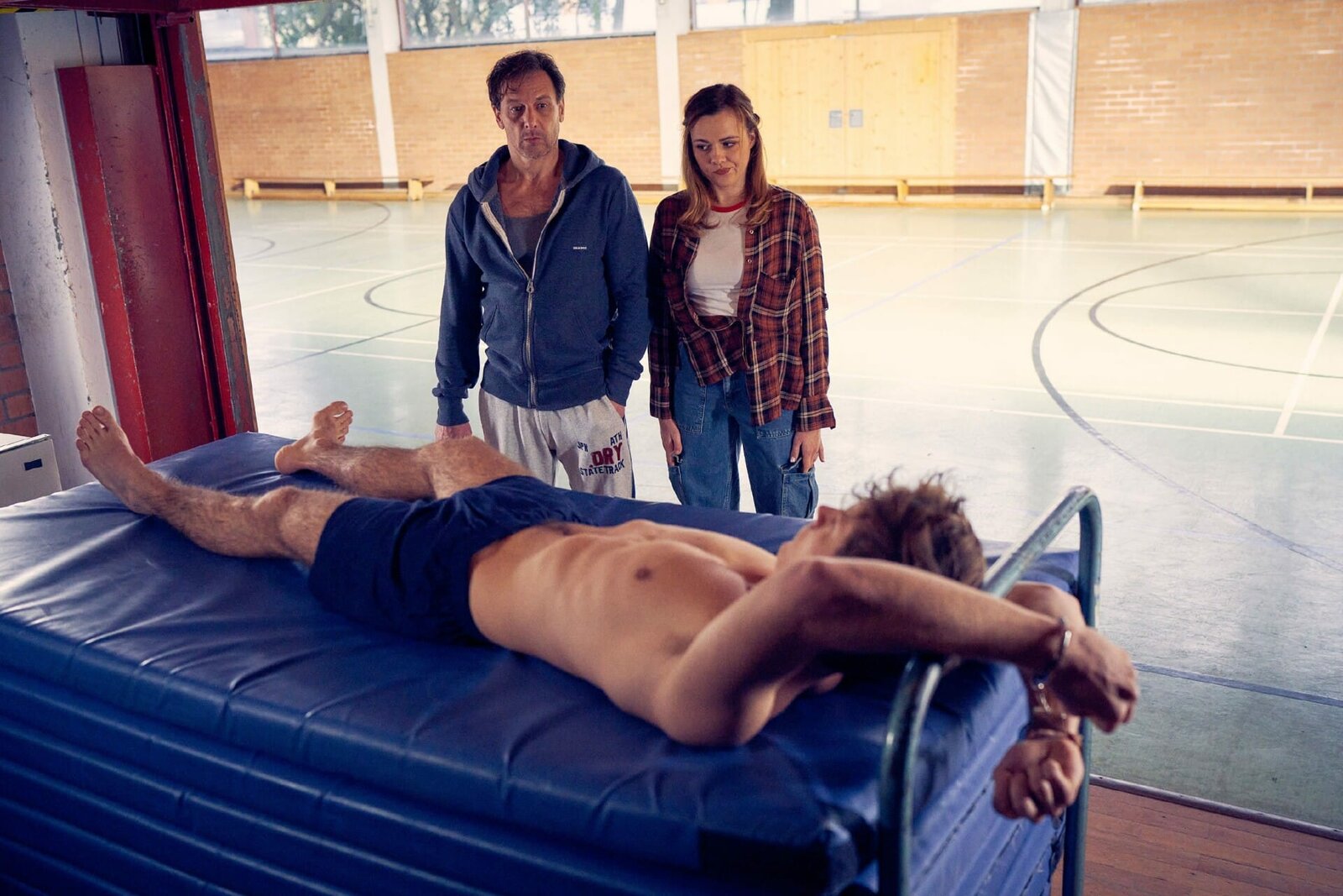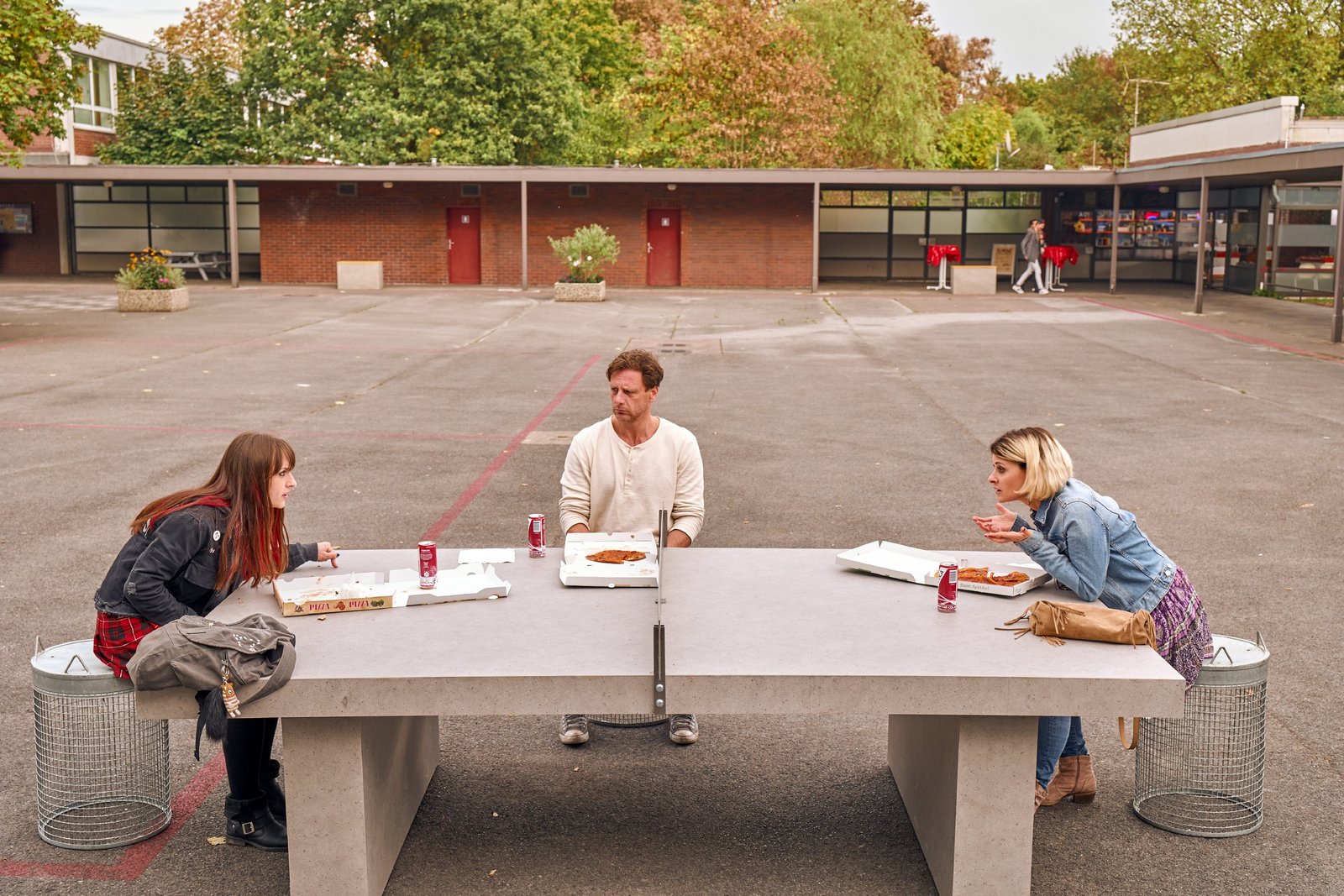 ...nimm dein Schwert mit!Stefan (Hendrik Duryn), Karin (Jessica Ginkel) und Frida (Ann-Sophie Lochmann) auf dem Schulhof.Bild: © TVNOW / Frank Dicks Foto: TVNOW / Frank Dicks