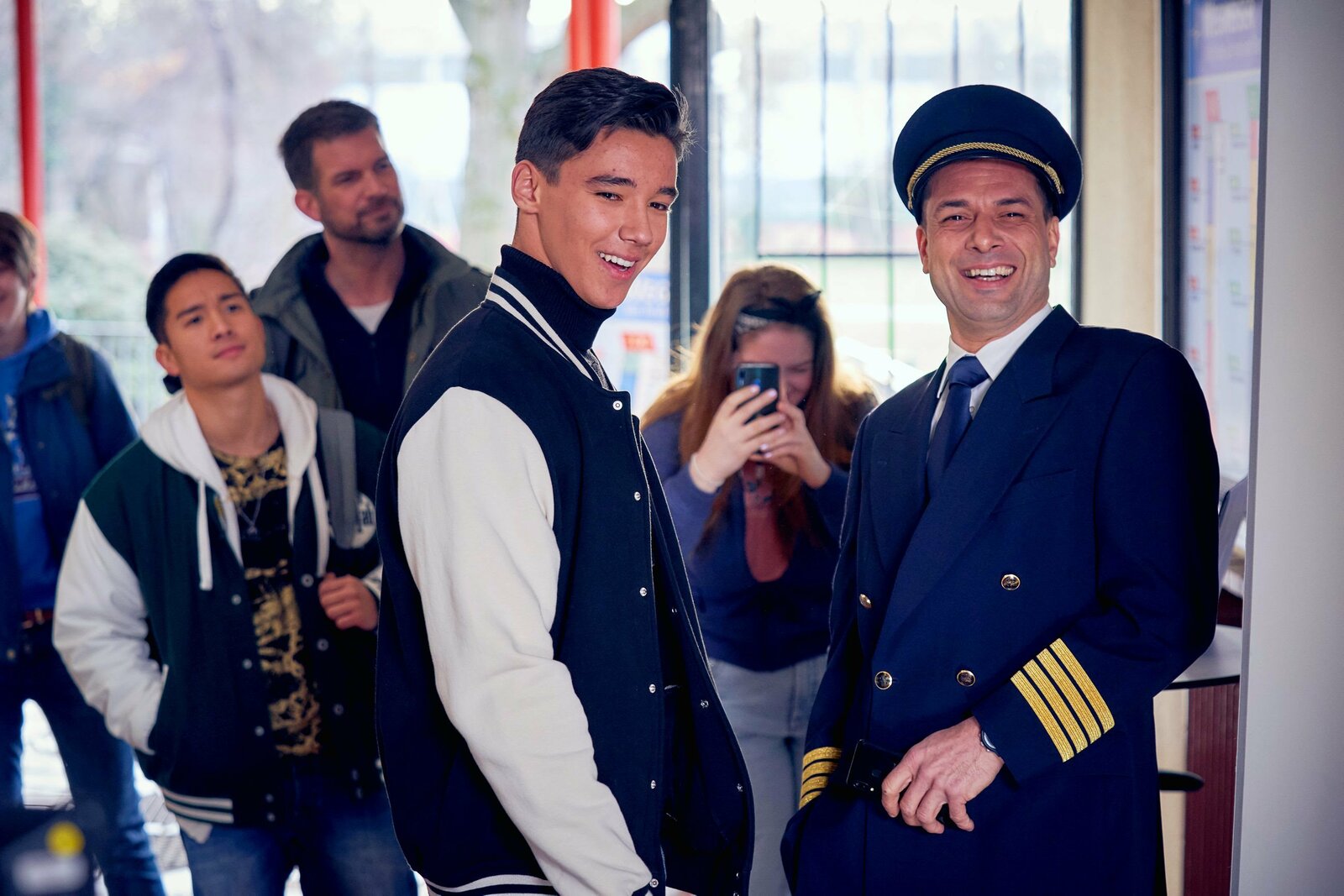 Ey, zu viele Geldscheine geraucht oder was?!Auf dem Berufsinformationstag in der Schule informiert sich Andres beim Pilotenstand. Doch er wird von Tobi (San Diego Pooth, 3.v.r.) und dessen Vater (Kai Schumann, r.), der Pilot ist, nicht ernst genommen. David (Simon Böer), Kiko (Jan Liem, l.) und Eileen stehen Andres bei. +++Bild: © TVNOW / Frank Dicks