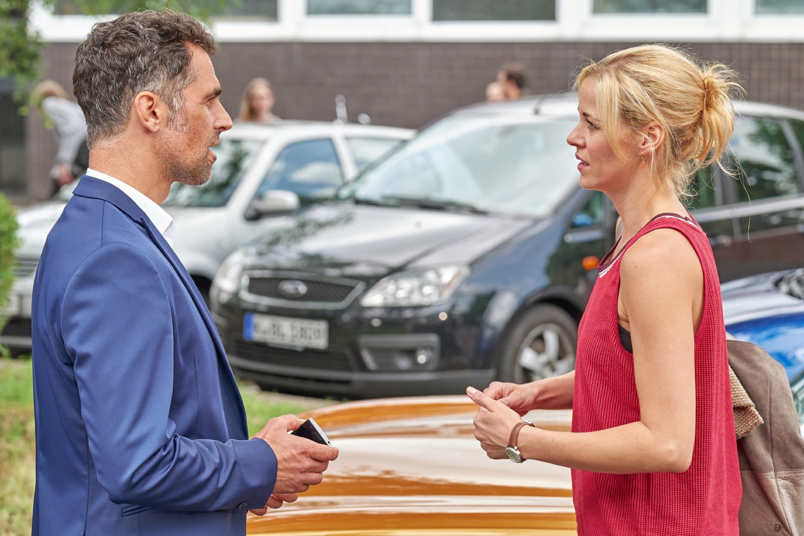 Schwing die Hufe Blondie!Sievers (Rainer Piwek) und Barbara (Nadine Wrietz) kommen an der Schule an.Bild: © RTL / Frank Dicks