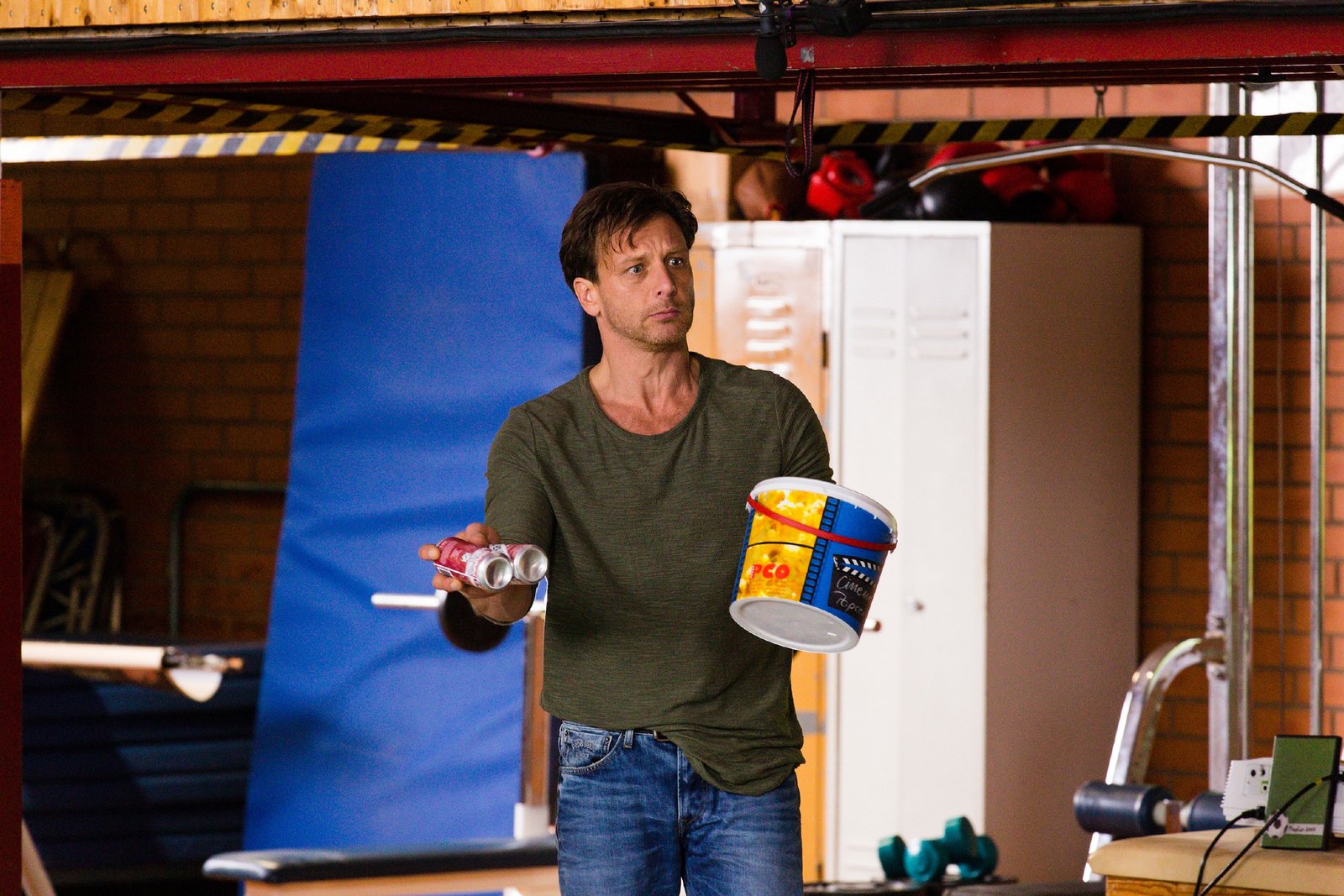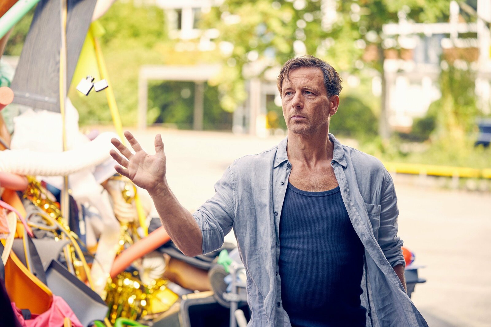 ... so'ne kleine Vollmerette!Stefan (Hendrik Duryn) fängt lässig das brennende Feuerzeug, mit dem Maya vor dem gesammelten Müllberg auf dem Schulhof stand. +++Bild: © TVNOW / Frank Dicks