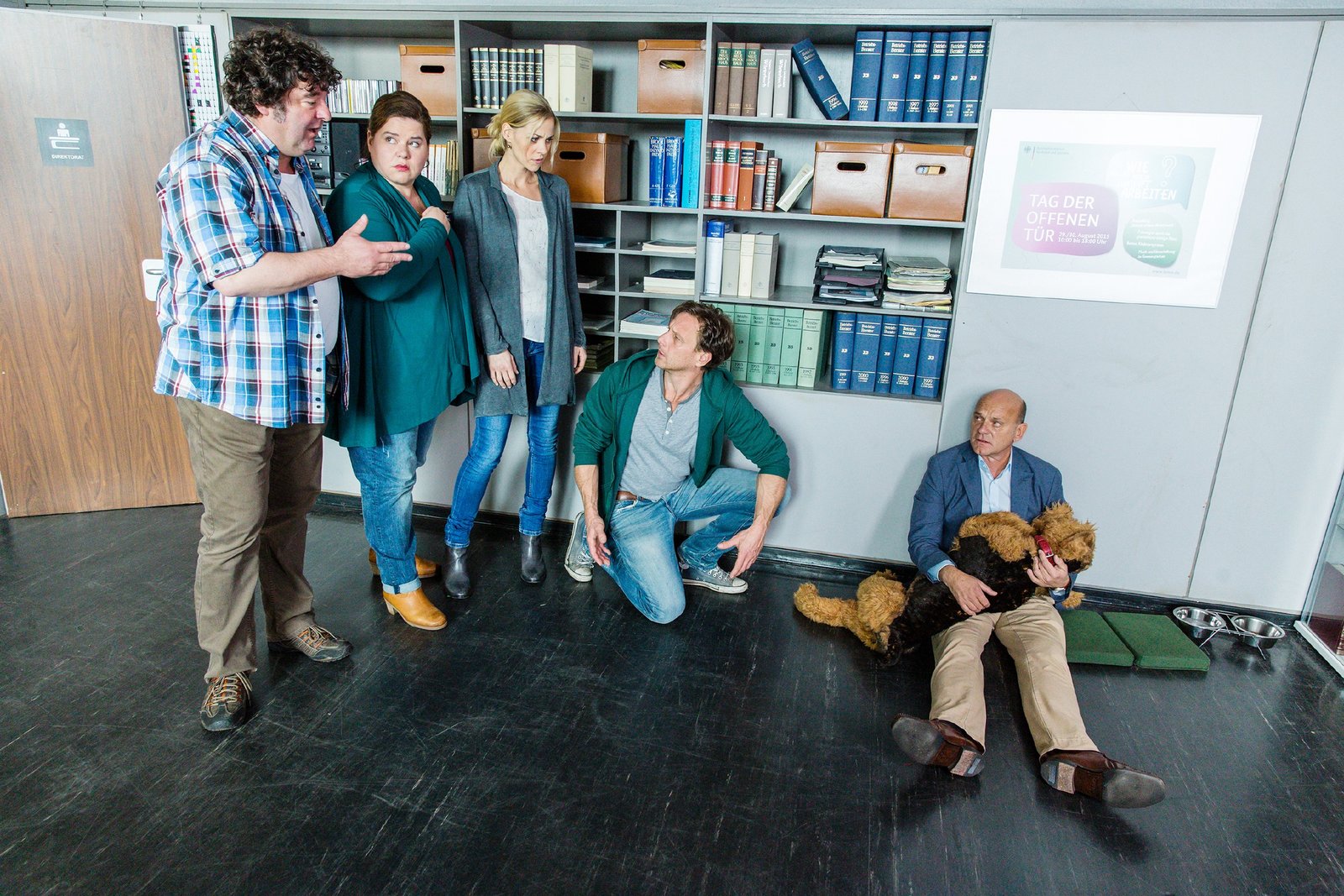 Schwing die Hufe Blondie!Sievers (Rainer Piwek, l.), Barbara (Nadine Wrietz, 2.v.l.), Karin (Jessica Ginkel) und Stefan (Hendrik Duryn, 2.v.r.) versuchen Direktor Rose (Uli Gebauer), dessen Hund Heisenberg gestorben ist, zu trösten.Bild: © RTL / Frank Dicks