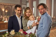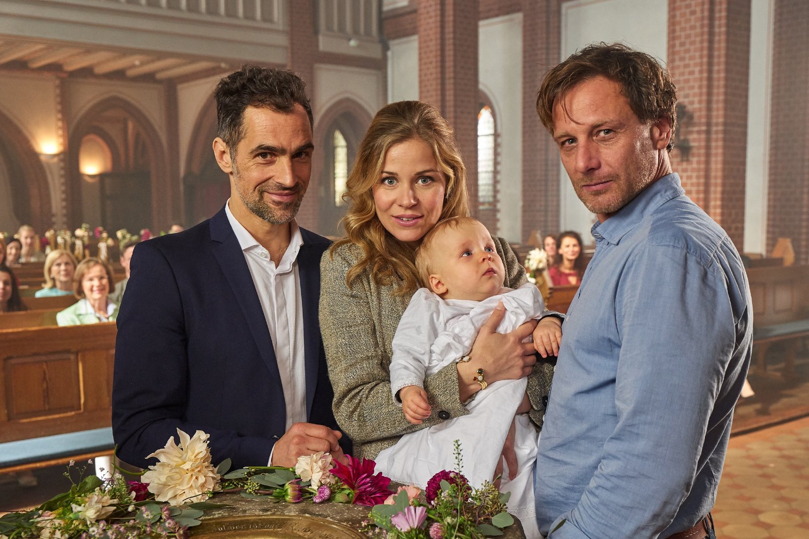 Pikante Details kosten extraMichael (Gabriel Merz, l.), Karin (Jessica Ginkel) und Stefan (Hendrik Duryn) bei der Taufe von Frida.Bild: © MG RTL D / Frank Dicks