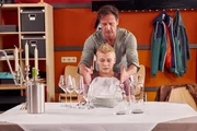 Ganz der Papa!Stefan Vollmer (Hendrik Duryn, oben) coacht Luis (Julius Nitschkoff) in Sachen Restaurant-Manieren, denn ausgerechnet der vulgäre Querulant Luis soll sich als aalglatter Verlagserbe Niklas ausgeben und Roses Schulführung loben.Bild: © RTL / Frank Dicks
