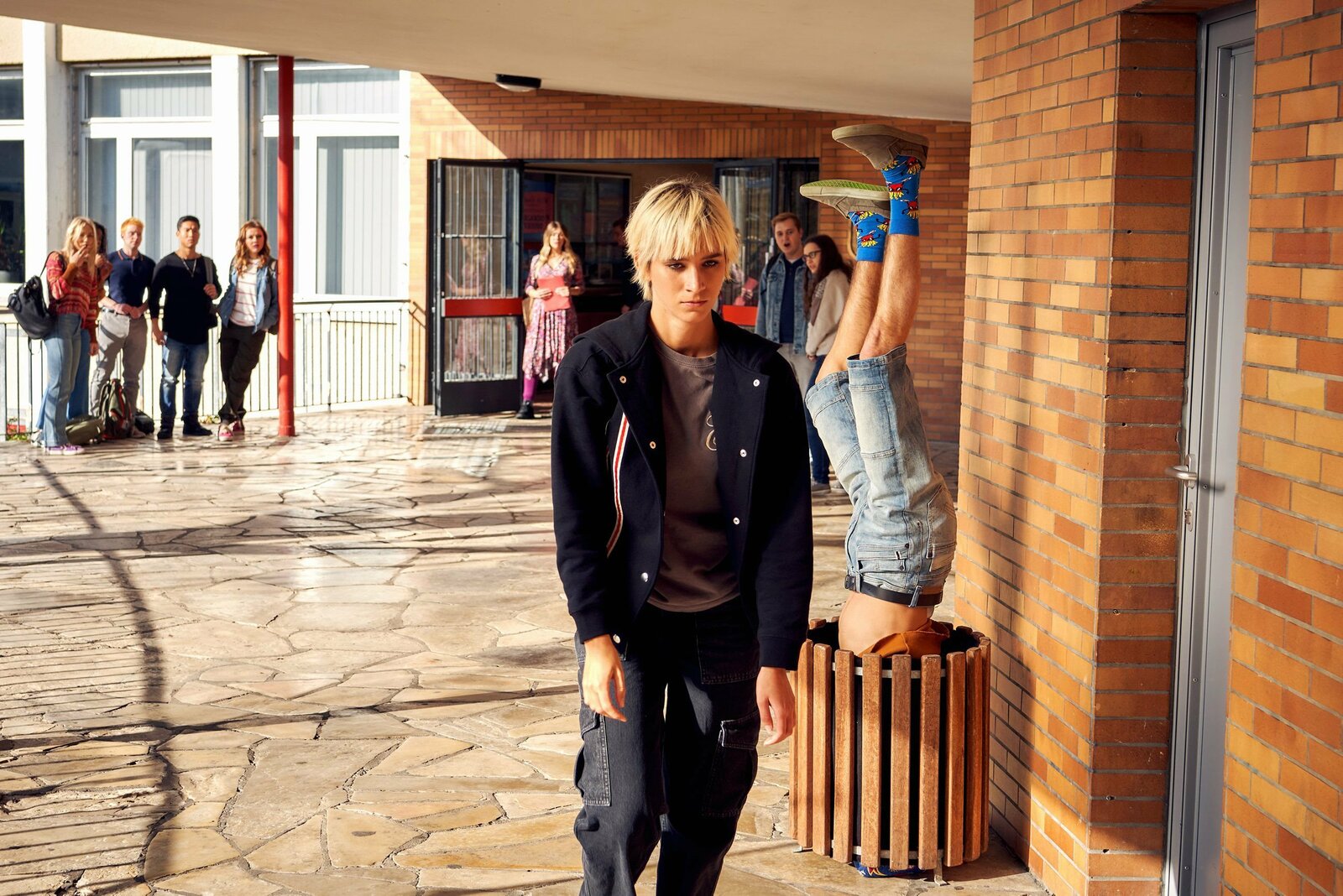 Der G-Kurs (v.l.) Anna (Lili Budach), Elani (Melodie Wakivuamina), Andres (Jonah Rausch) Kiko (Jan Liem) und Betty (Yvonne Pferrer) provozieren Selma (Annika Baumann). Die schnappt sich Klaus (Loic Lopes, r.) und steckt ihn in einen Mülleimer. +++Bild: © TVNOW / Frank Dicks